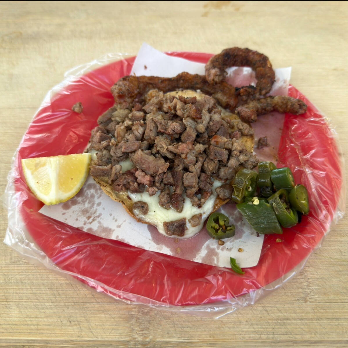 Tortilla taquera con queso y proteína de su preferencia, acompañada de diversas verduras y salsas (frijol, repollo, salsa bandera, guacamole, limón, pepino, chiles asados, rabano).