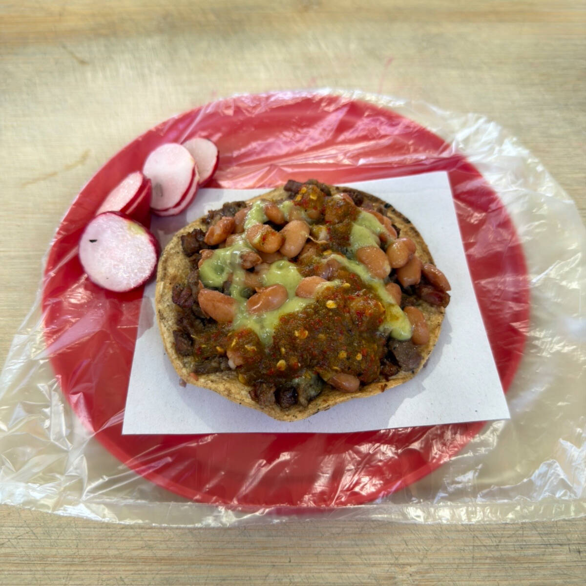 Tostada con queso y proteína de su preferencia, acompañado de diversas verduras y salsas (frijol, repollo, salsa bandera, guacamole, limón, pepino, chiles asados, rabano).