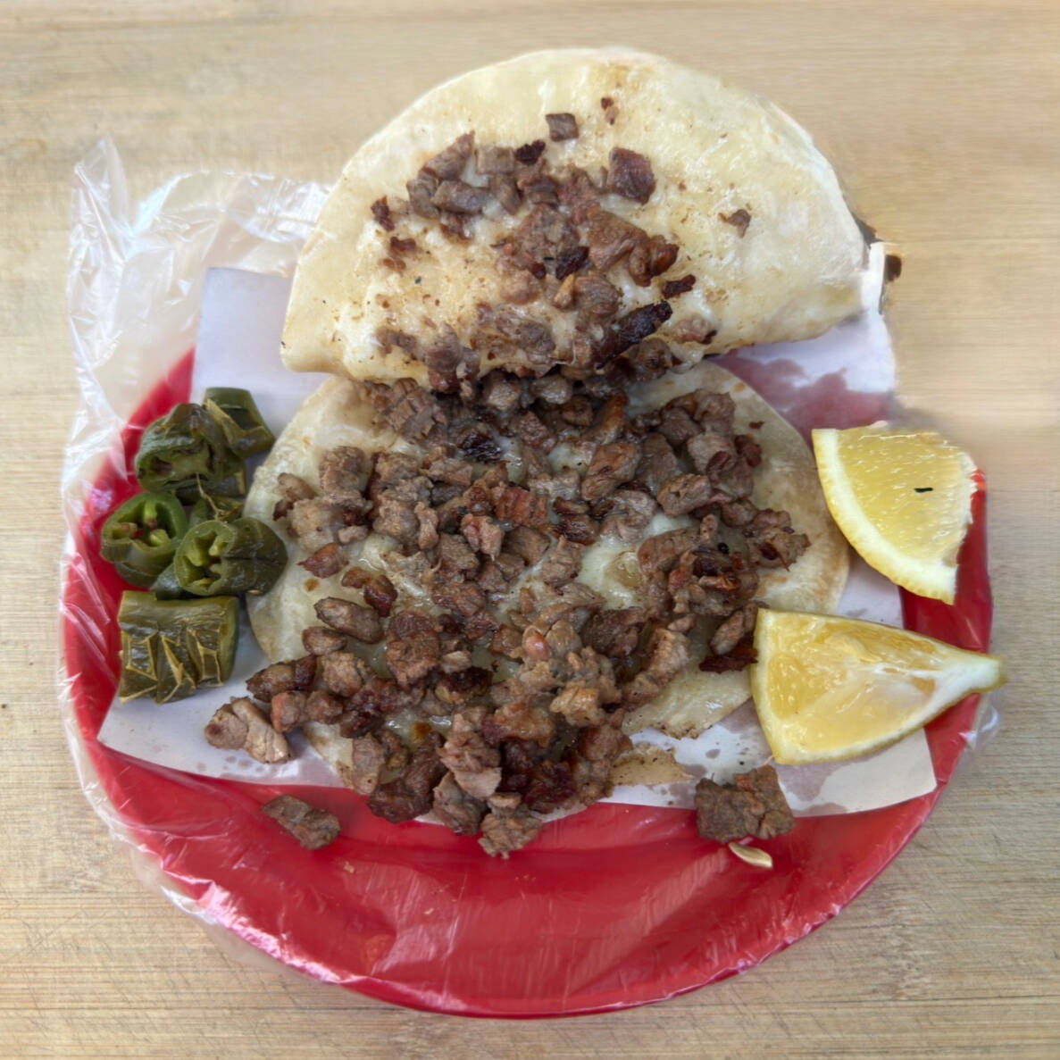 Doble tortilla taquera con queso y proteína de su preferencia, acompañada de diversas verduras y salsas (frijol, repollo, salsa bandera, guacamole, limón, pepino, chiles asados, rabano).