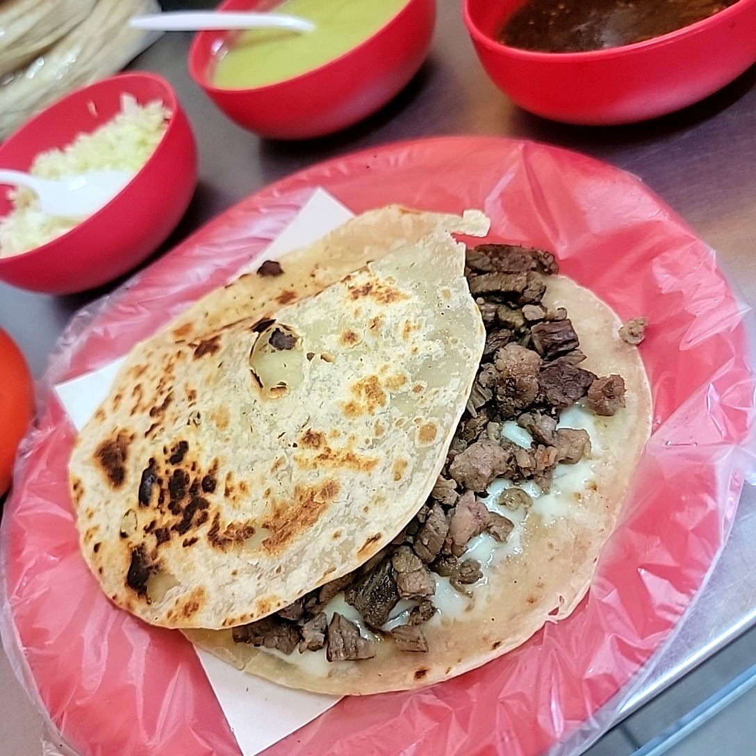 cama de tortilla con costra de queso fundido con carne asada mas queso fundido y tortilla encima de harina