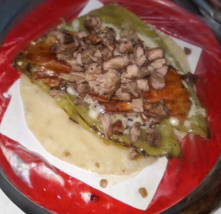 tortilla de harina o maiz con un chile california con una costra de queso y carne a elegir