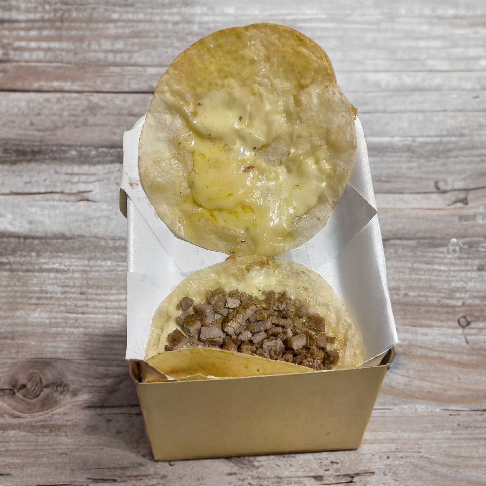 tortilla de maiz crujiente con queso monterrey y carne a elegir