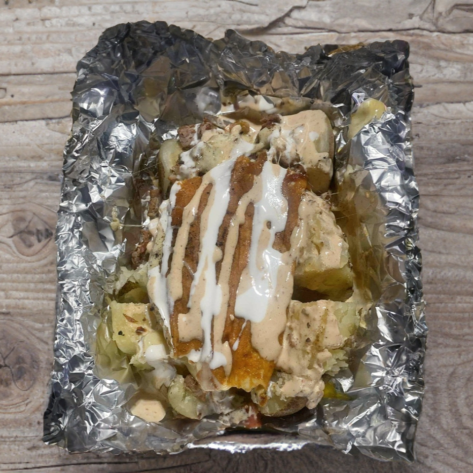 papa rellena de carne asada con crema, chipotle y una costra de queso jack monterrey