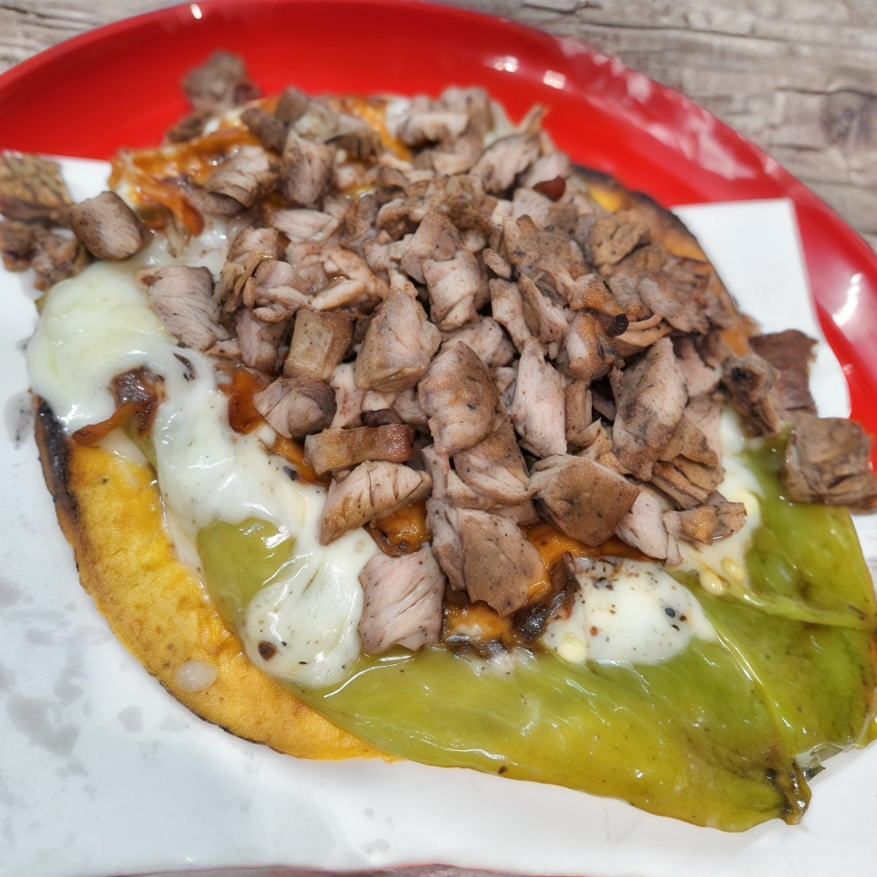 tostada de maiz con un chile california costra de queso y carne a elegir
