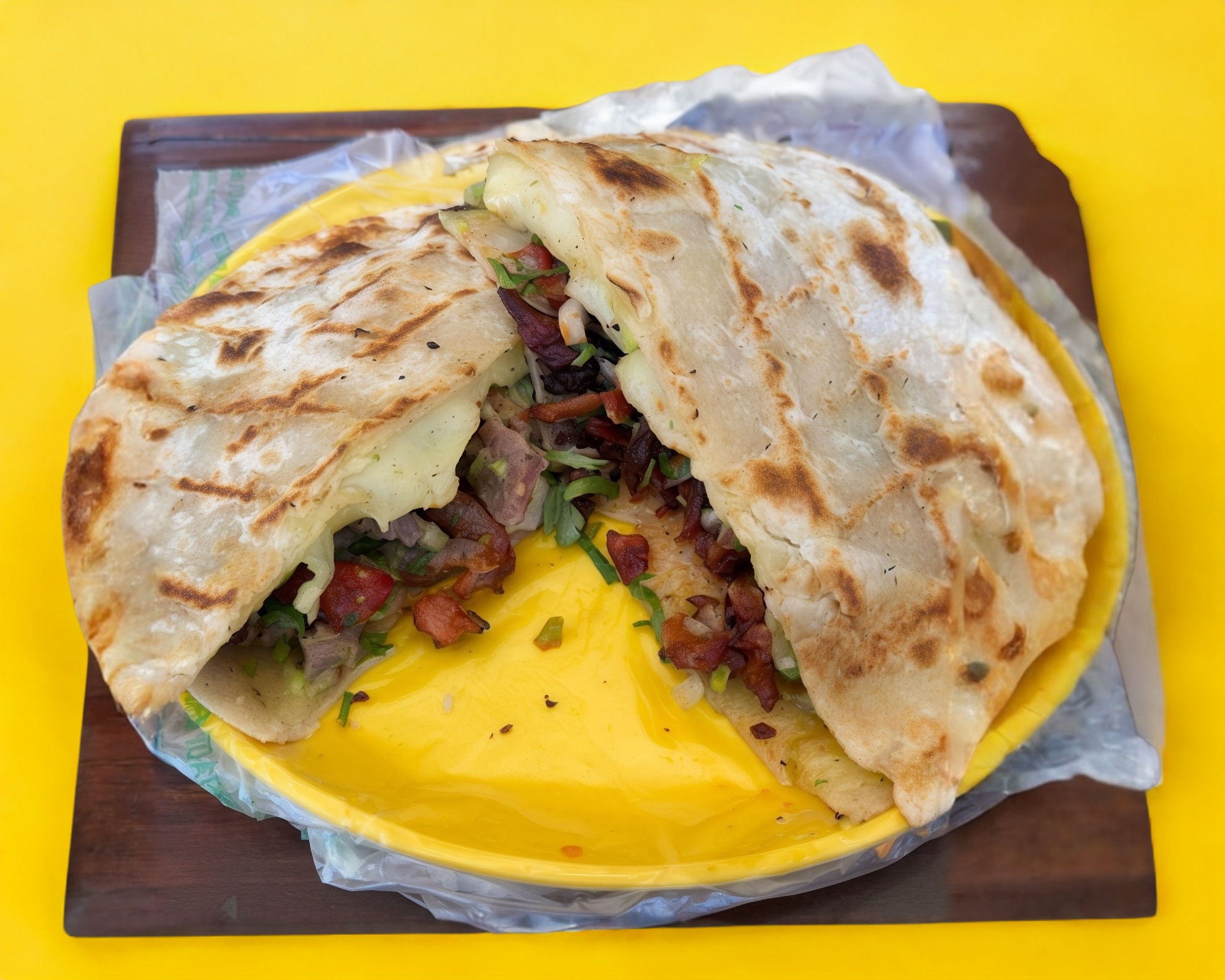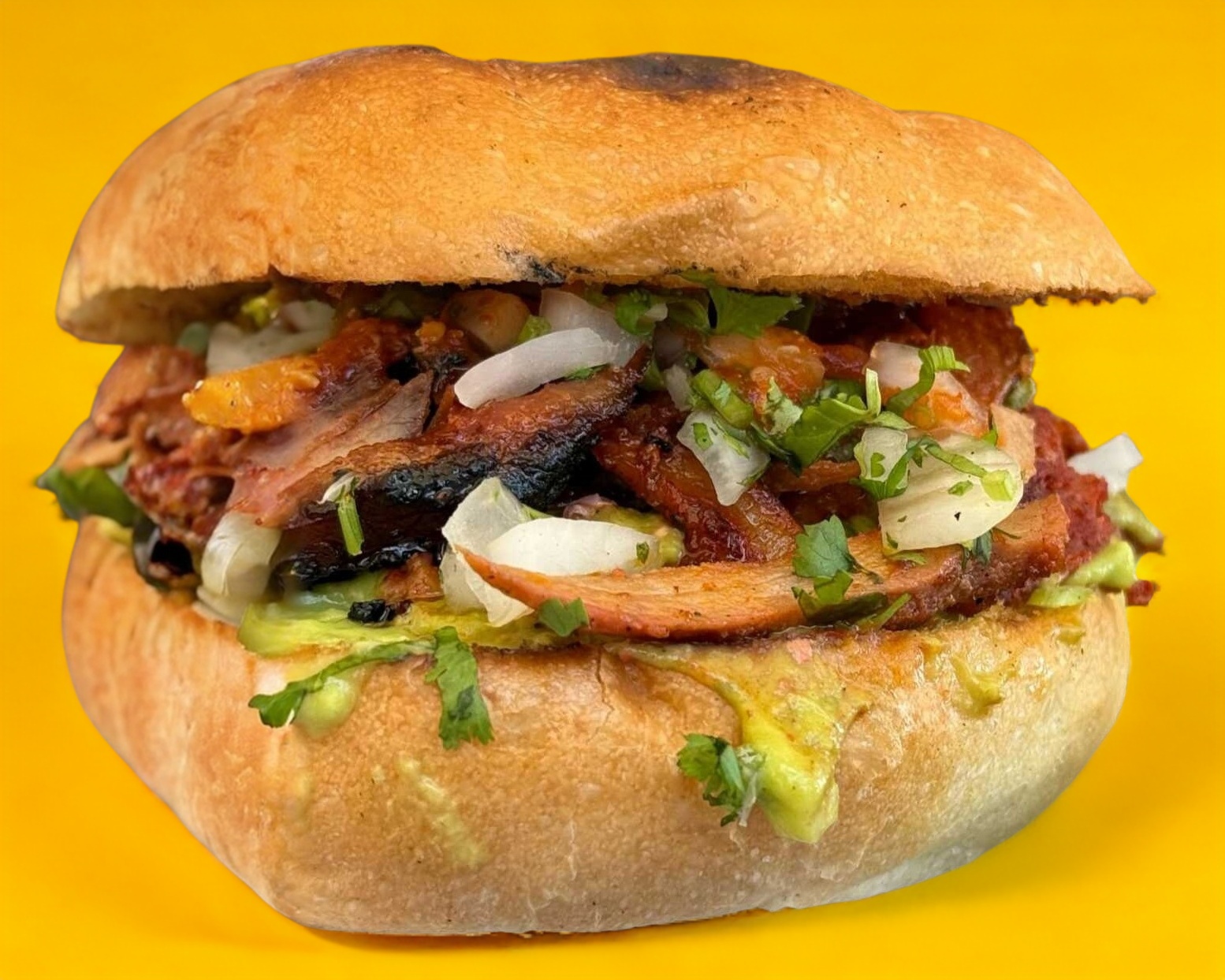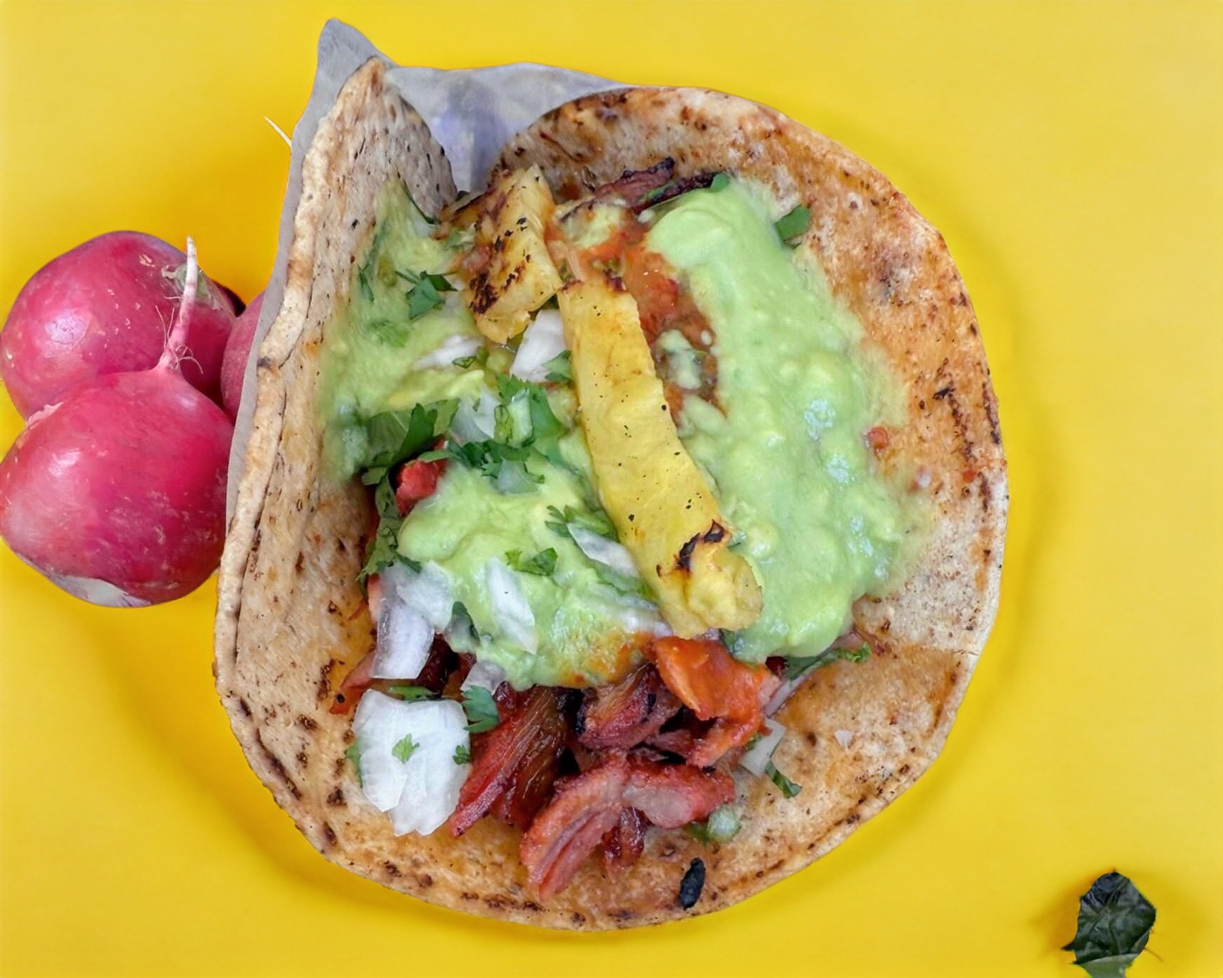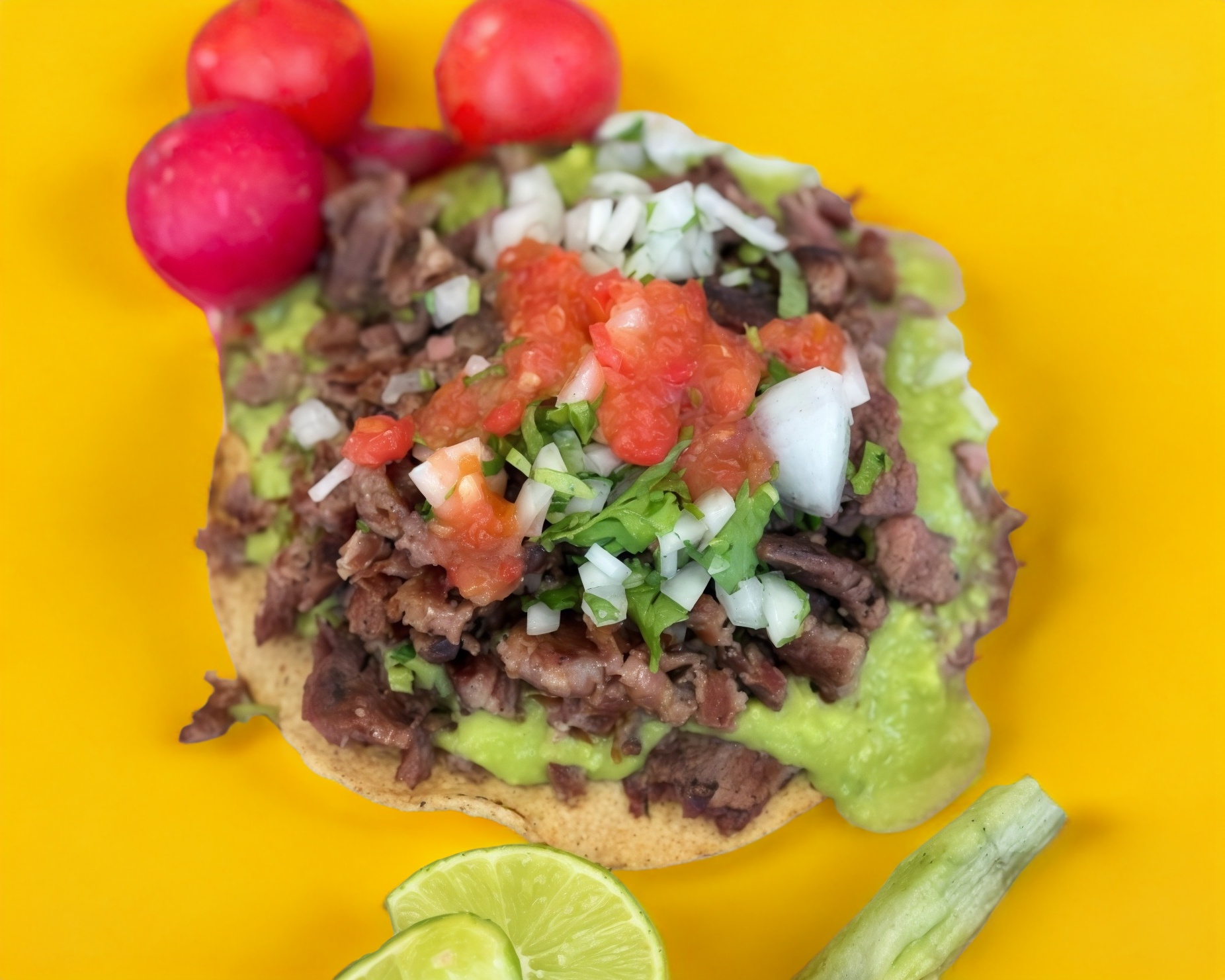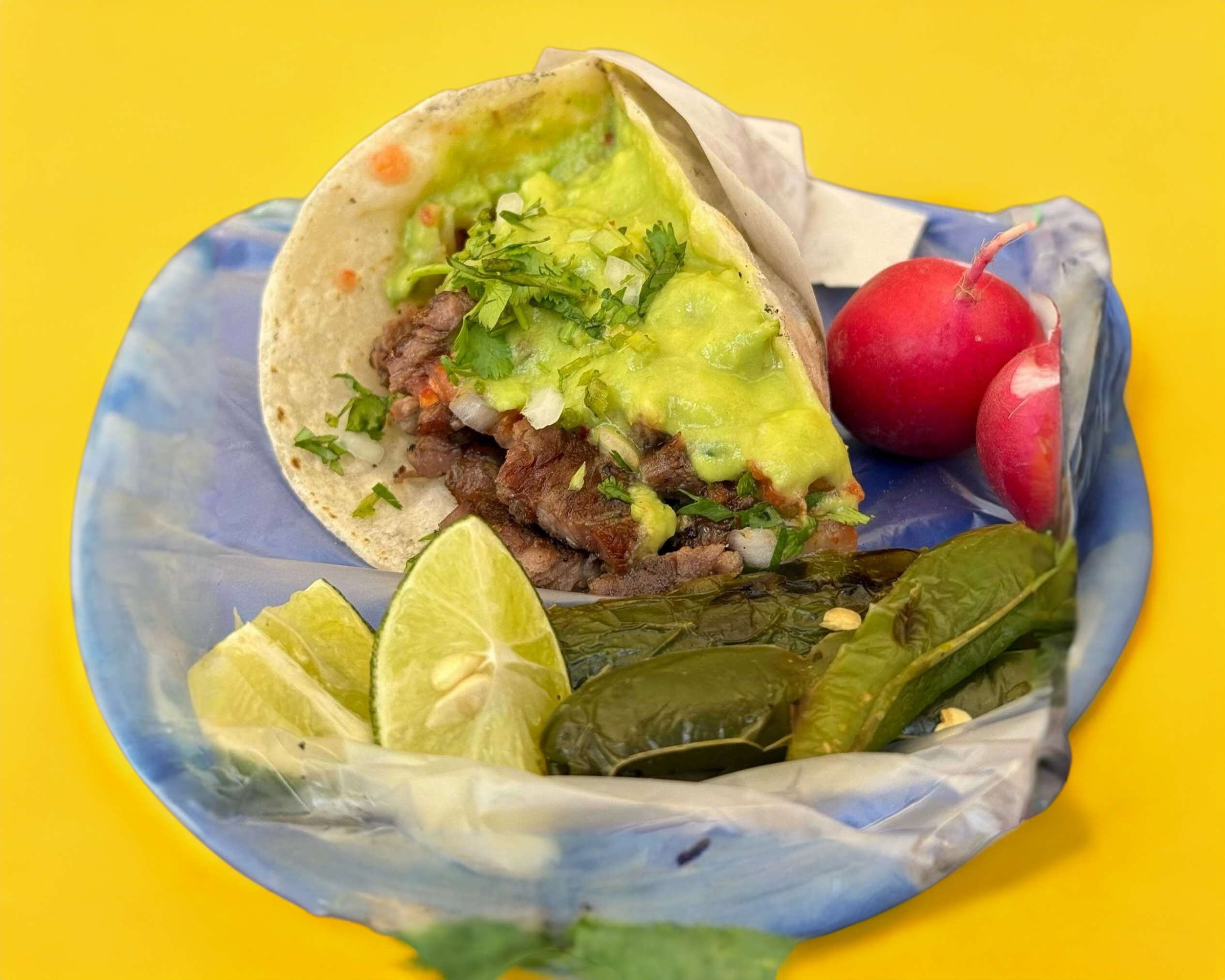 pastor y asada, salsa, guacamole, cebolla y cilantro