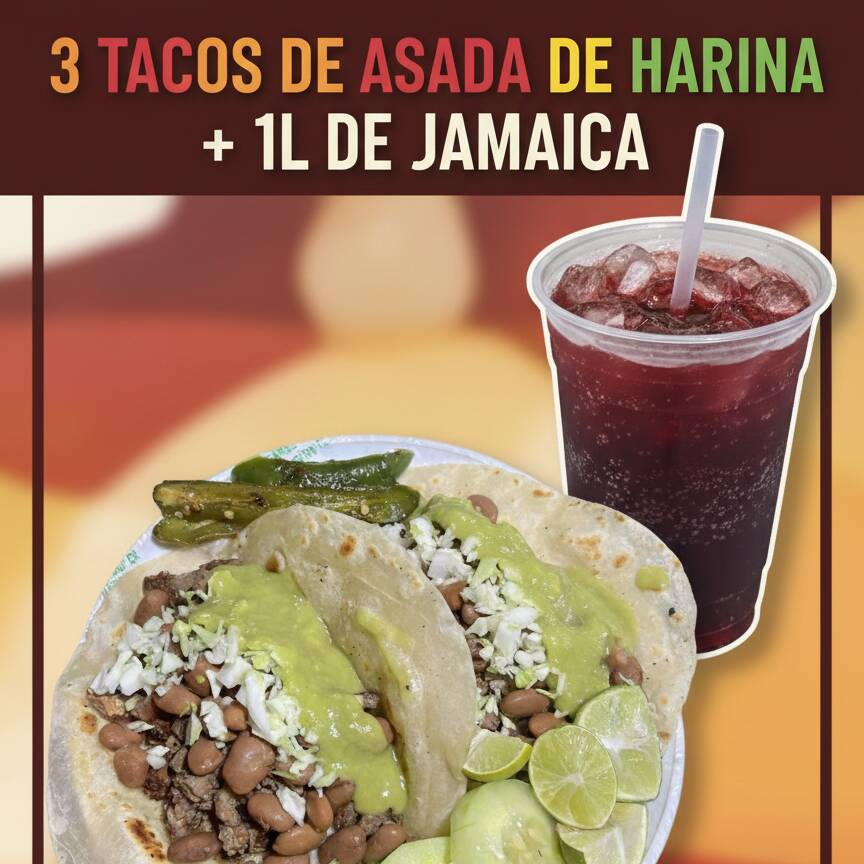 3 Tacos de Asada de Harina + 1L de Jamaica