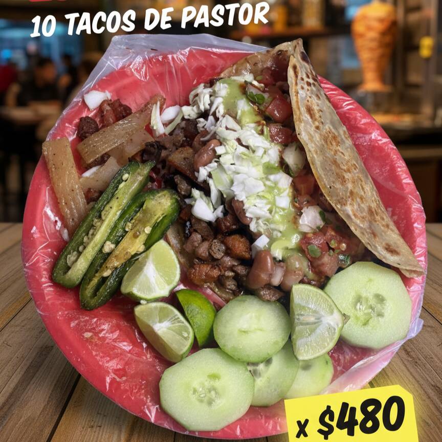 10 tacos de pastor de tortilla de harina con todas sus guarniciones aparte