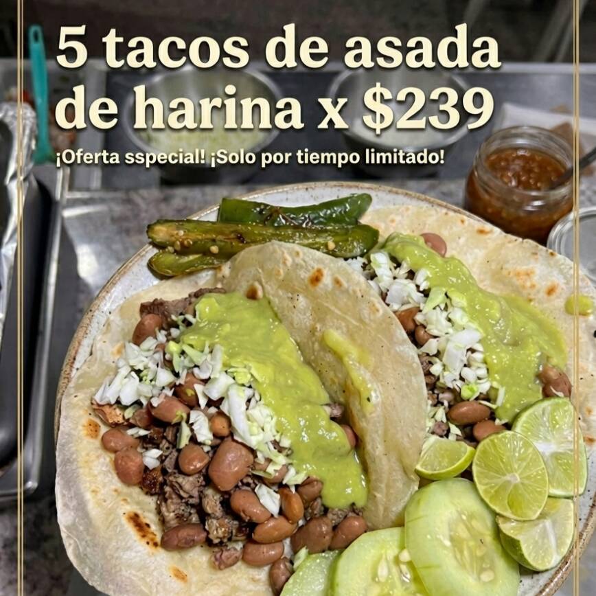 5 tacos de carne asada de tortilla de harina con todas sus guarniciones aparte