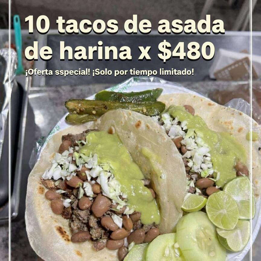 10 tacos de asada de tortilla de harina con todas sus guarniciones aparte