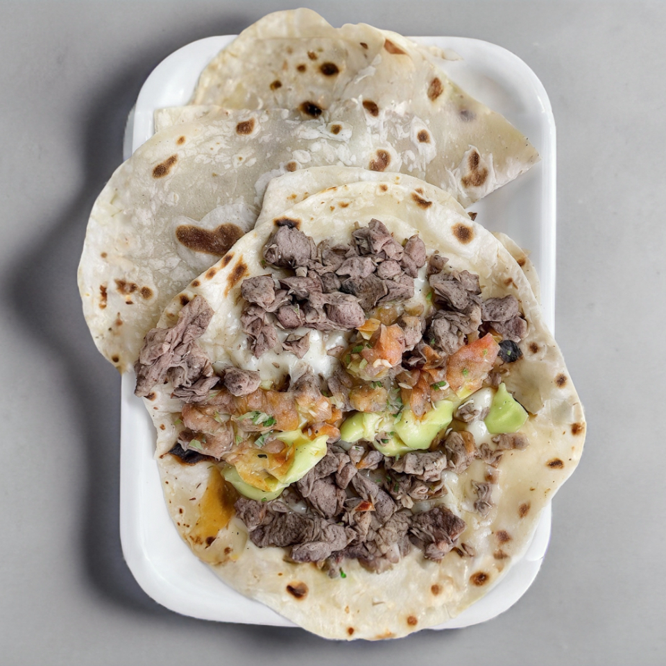 Dos tortillas de harina grandes queso entre las dos carne Asada,Salsa,guacamole,repollo, cilantro, cebolla,frijoles,Banderita