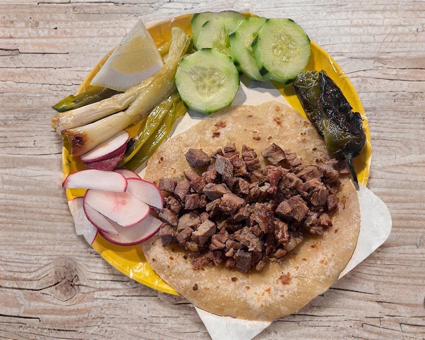 1 taco de carne asada con tortilla a elegir, acompañado de salsas de la casa, guacamole, cebollitas y chiles asados.