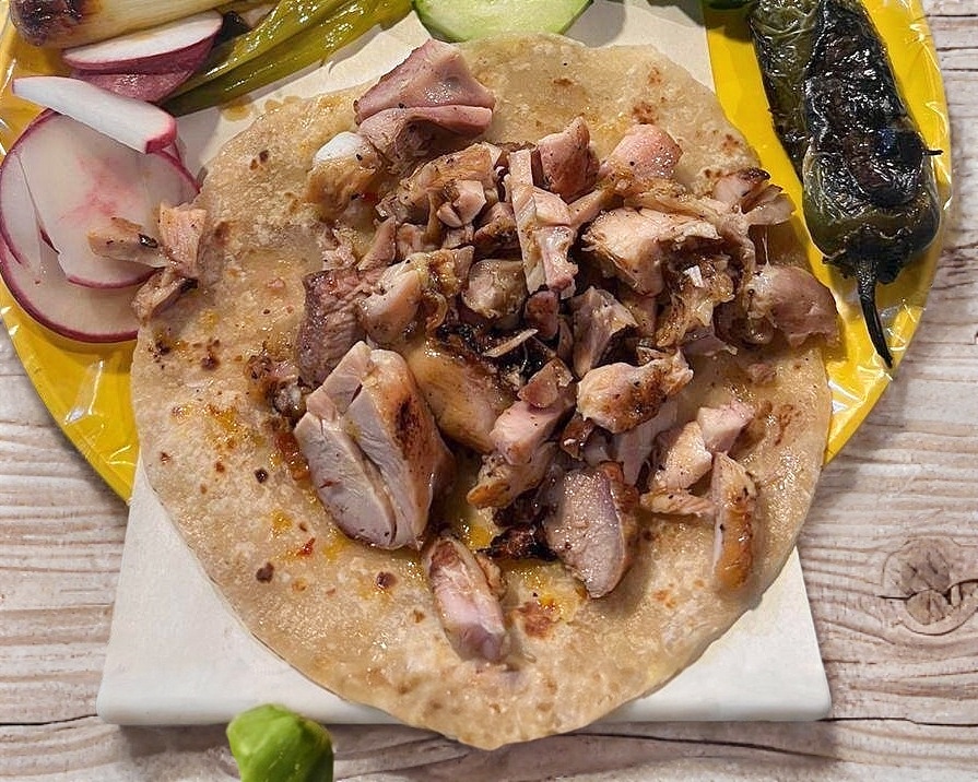 1 Taco de pollo con tortilla a elegir, acompañado de salsas de la casa, guacamole, cebollitas y chiles asados.