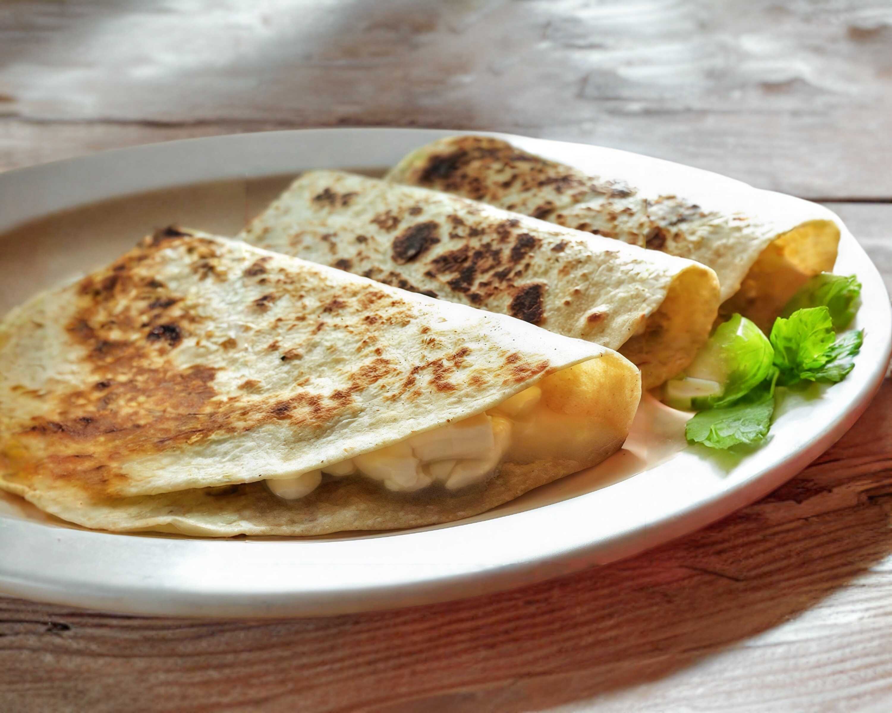 1 Quesadilla con tortilla a elegir, queso, acompañada de salsa de la casa, guacamole, cebollita y chile asado.