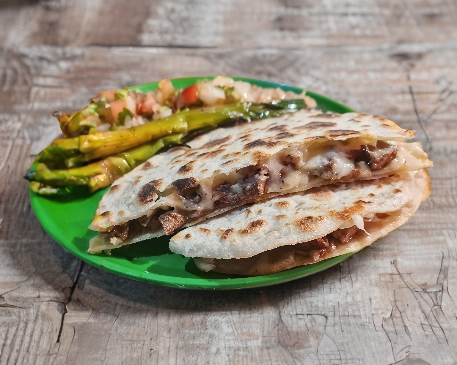 1 Quesadilla con carne y tortilla a elegir, queso, acompañada de salsa de la casa, guacamole, cebollita y chile asado.