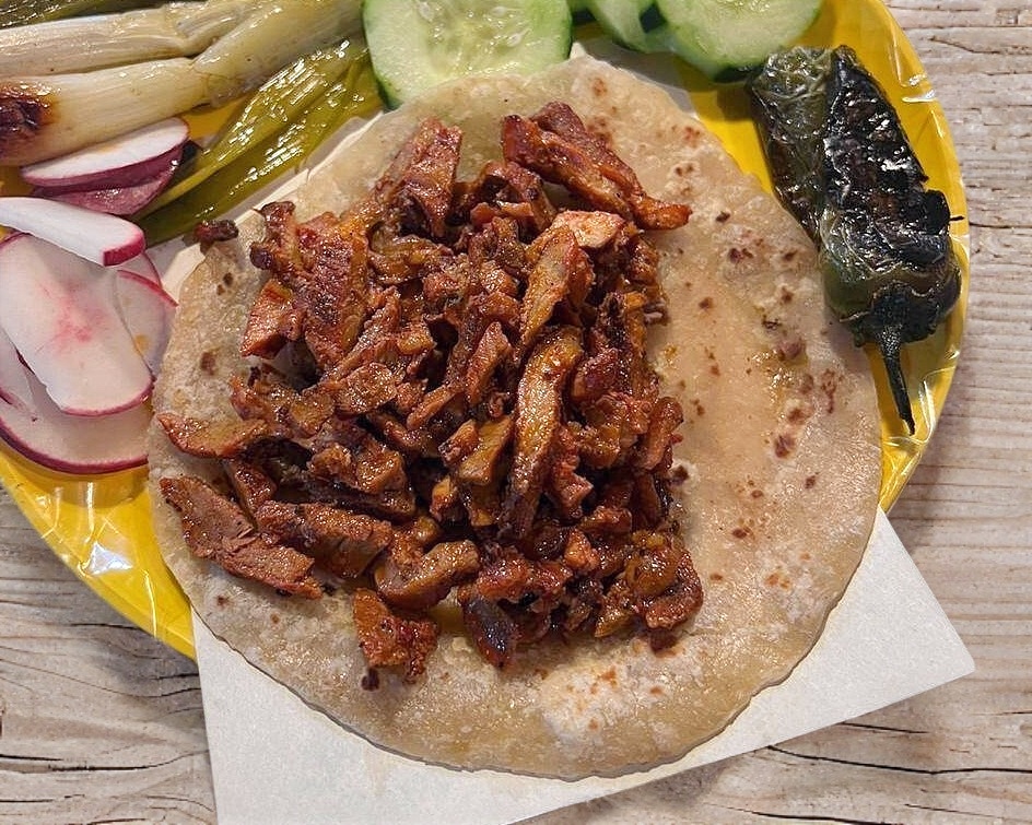 1 Taco de pastor con tortilla a elegir, acompañado de salsas de la casa, guacamole, cebollita y chile asado.