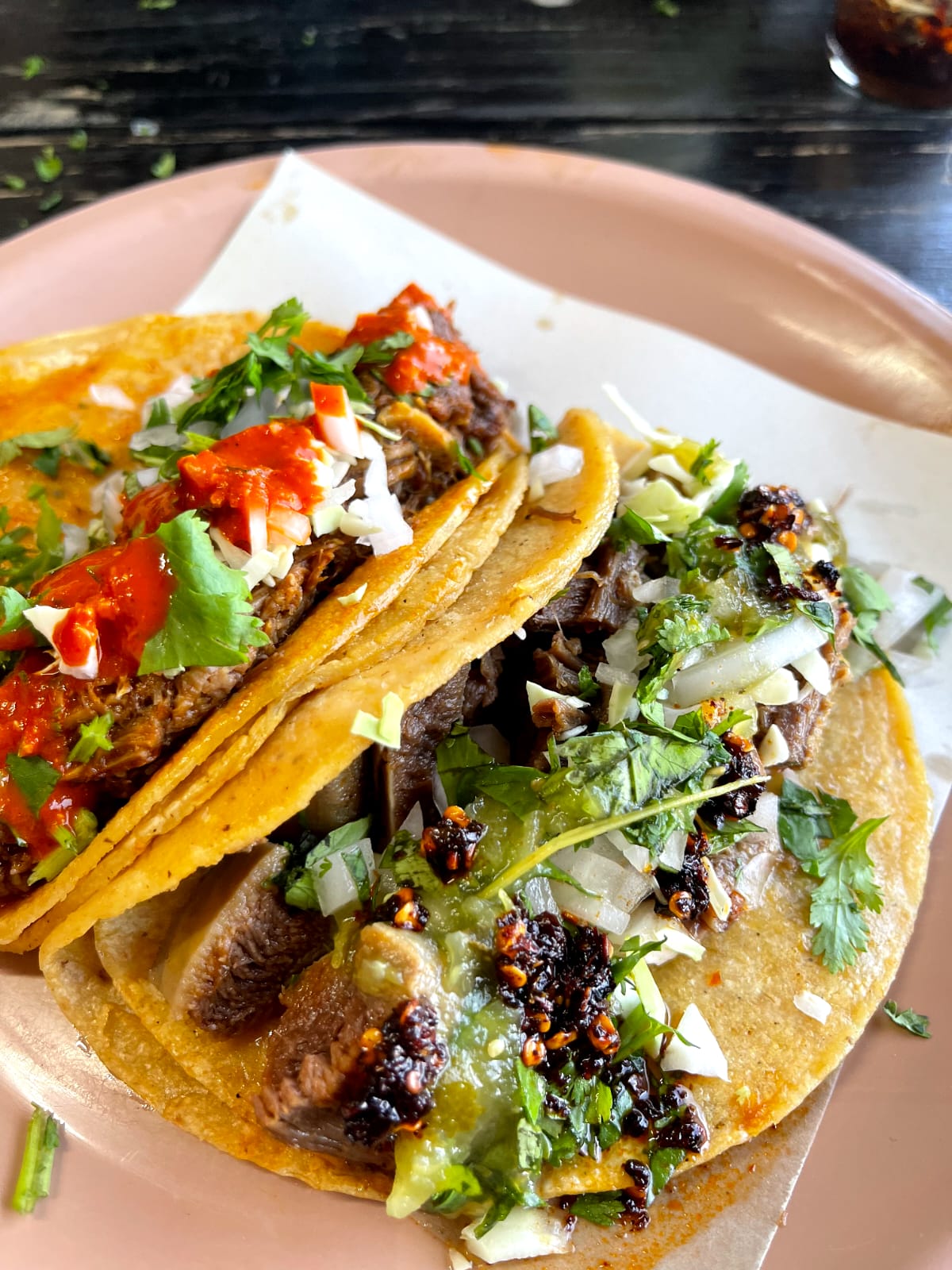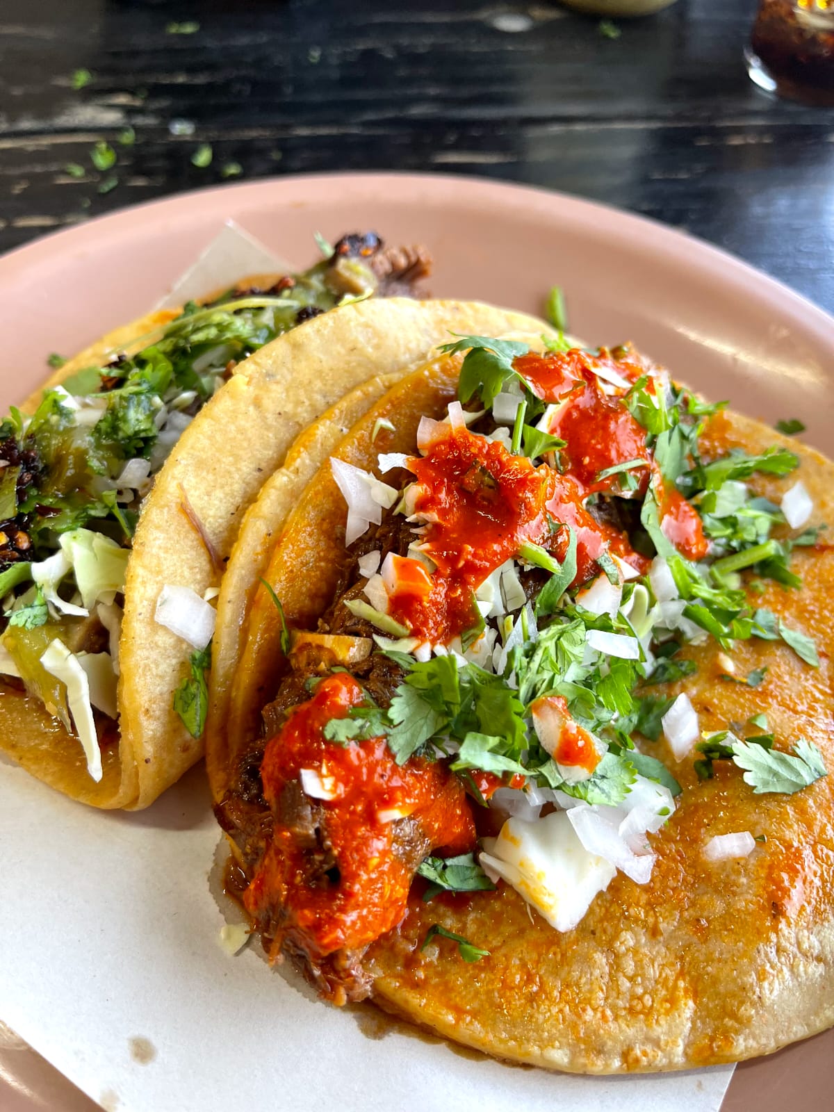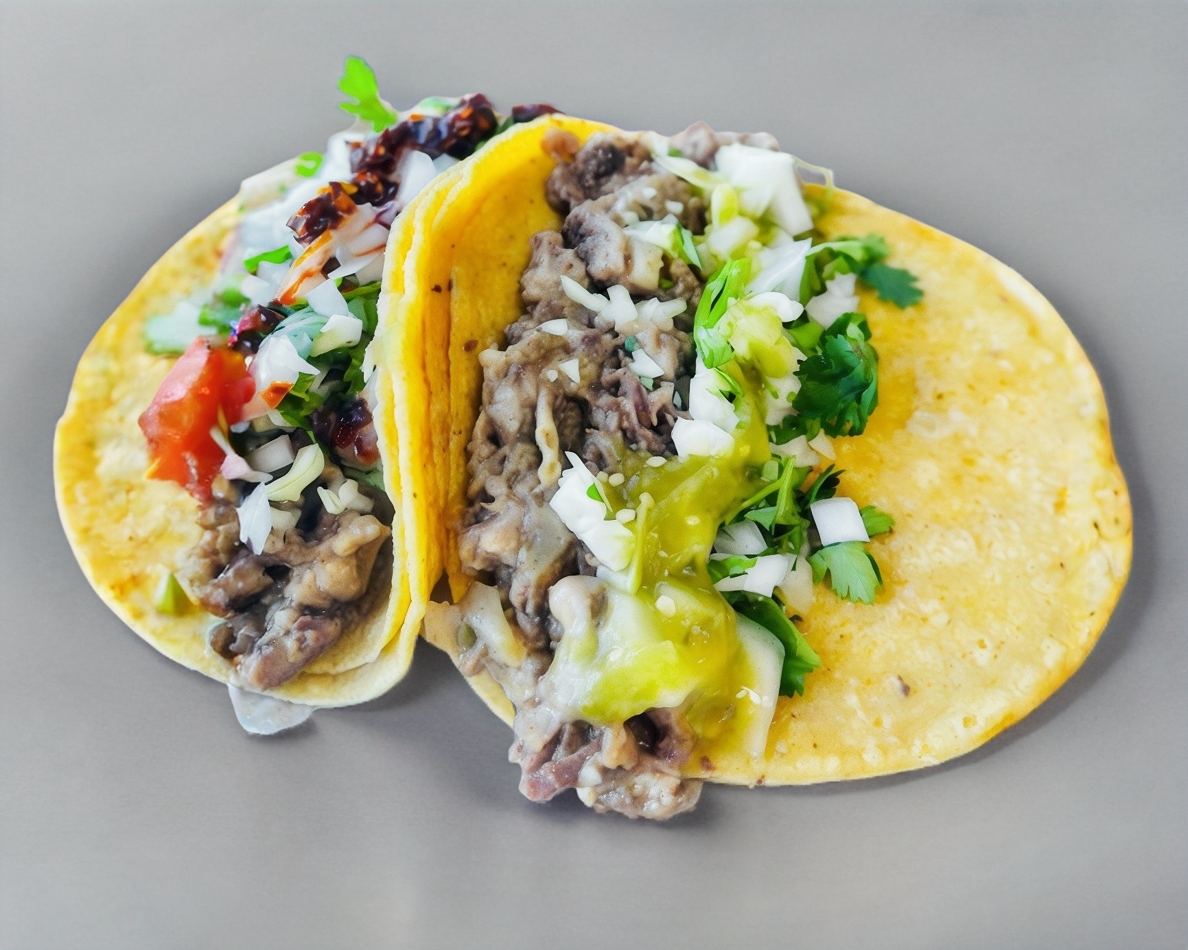 Delicioso taco de ojo de res en doble tortilla de maíz, lista para ser preparado al gusto con verdura fresca y ricas salsas de la casa.