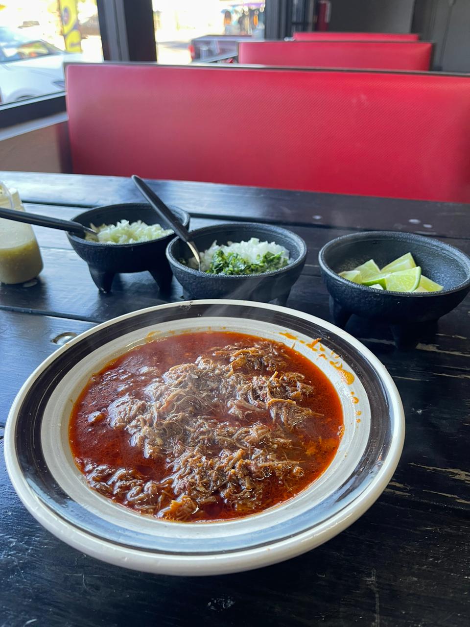 Delicioso jugo con lengua de res acompañado de 5 tortillas.