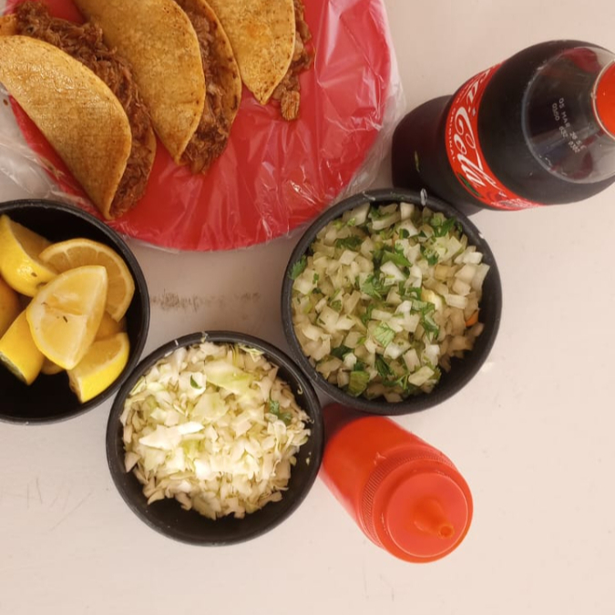 cebolla con cilantro,repollo,limon,salsa roja o verde. 4tortillas maiz