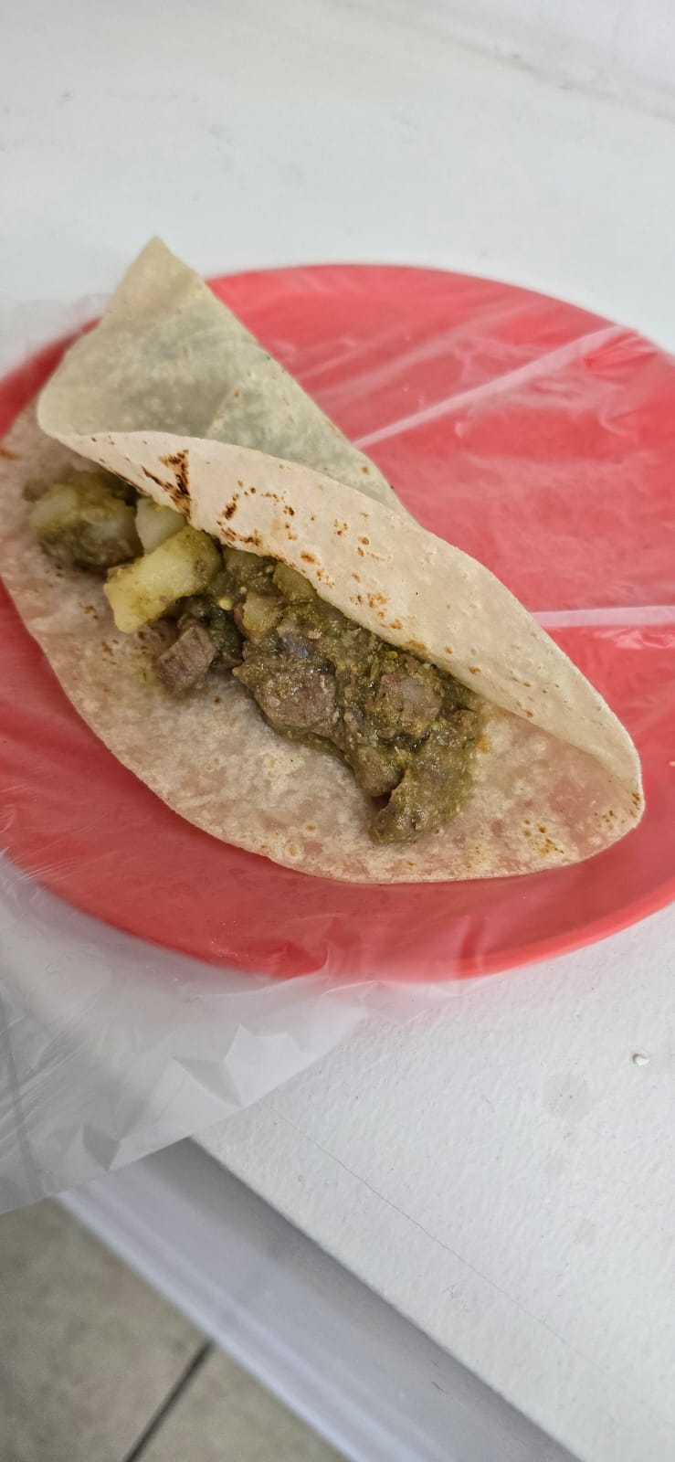 Taco con bistec bañado en una salsa verde casera, ideal para paladares picantes.