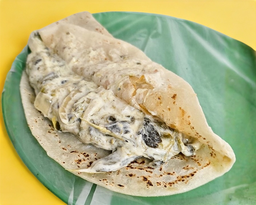Taco con rajas de chile poblano en crema, suave y delicioso.
