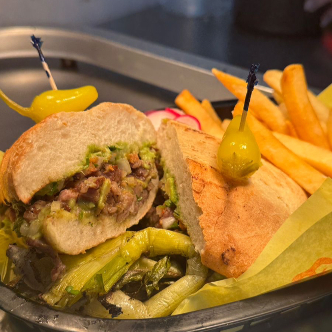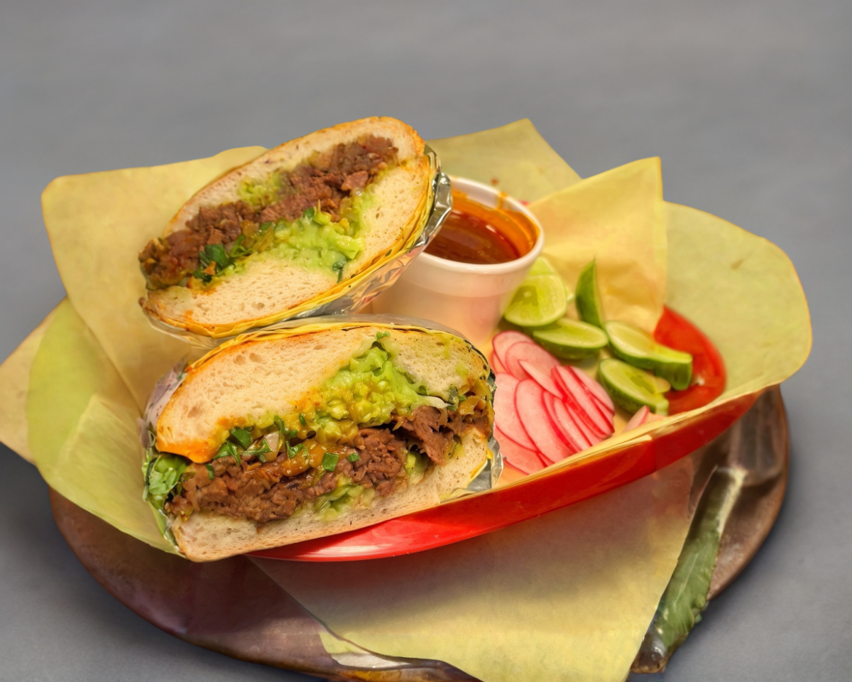 pan ciabatta, carne de res marinada en casa, cilantro, cebolla blanca, salsa roja taquera y guacamole.