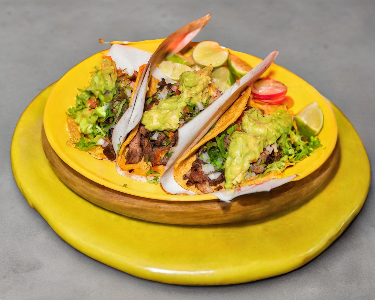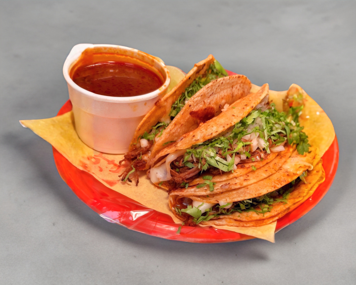 Tortilla Maiz/Harina… carne de res marinada en casa, costra de queso, cilantro, cebolla blanca, salsa roja taquera y guacamole.
