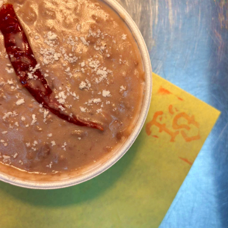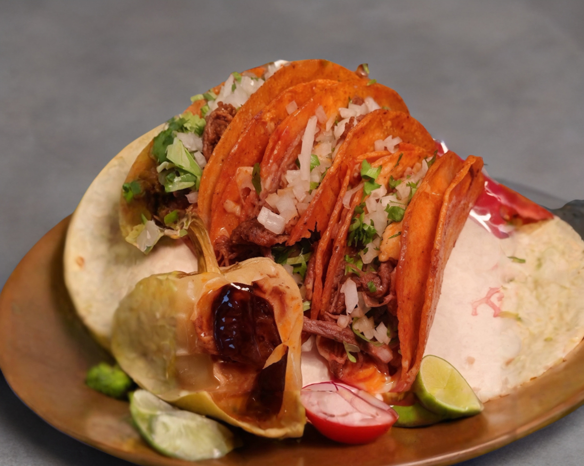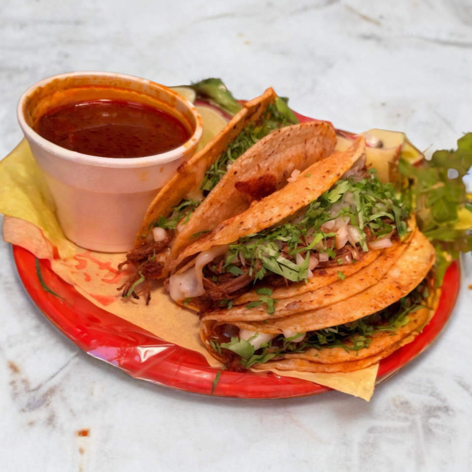Tortilla Maiz semi dorada, birria de res horneada, cebolla blanca, cilantro, salsa macha y consomé para acompañar.