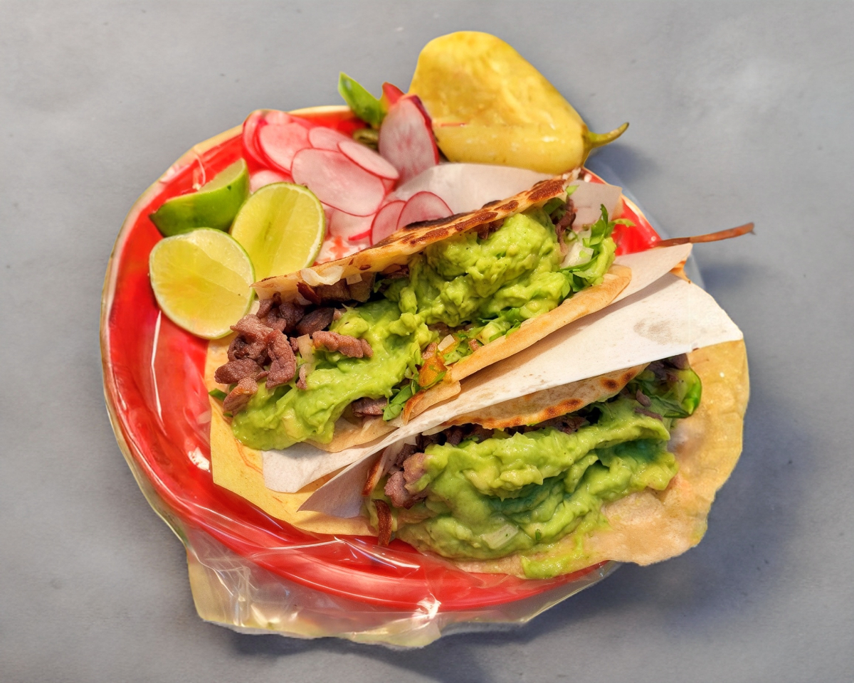 Tortilla Maiz/Harina… carne de res marinada en casa y chorizo de cerdo premium, costra de queso, cilantro, cebolla blanca, salsa roja taquera y guacamole.