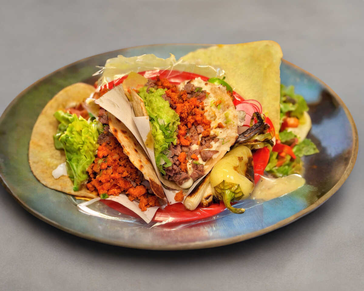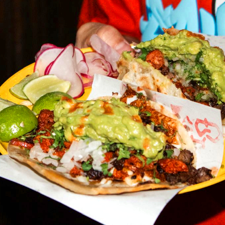 Tortilla Maiz/Harina… carne de res marinada en casa y chorizo de cerdo premium, cilantro, cebolla blanca, salsa roja taquera y guacamole.