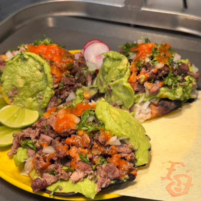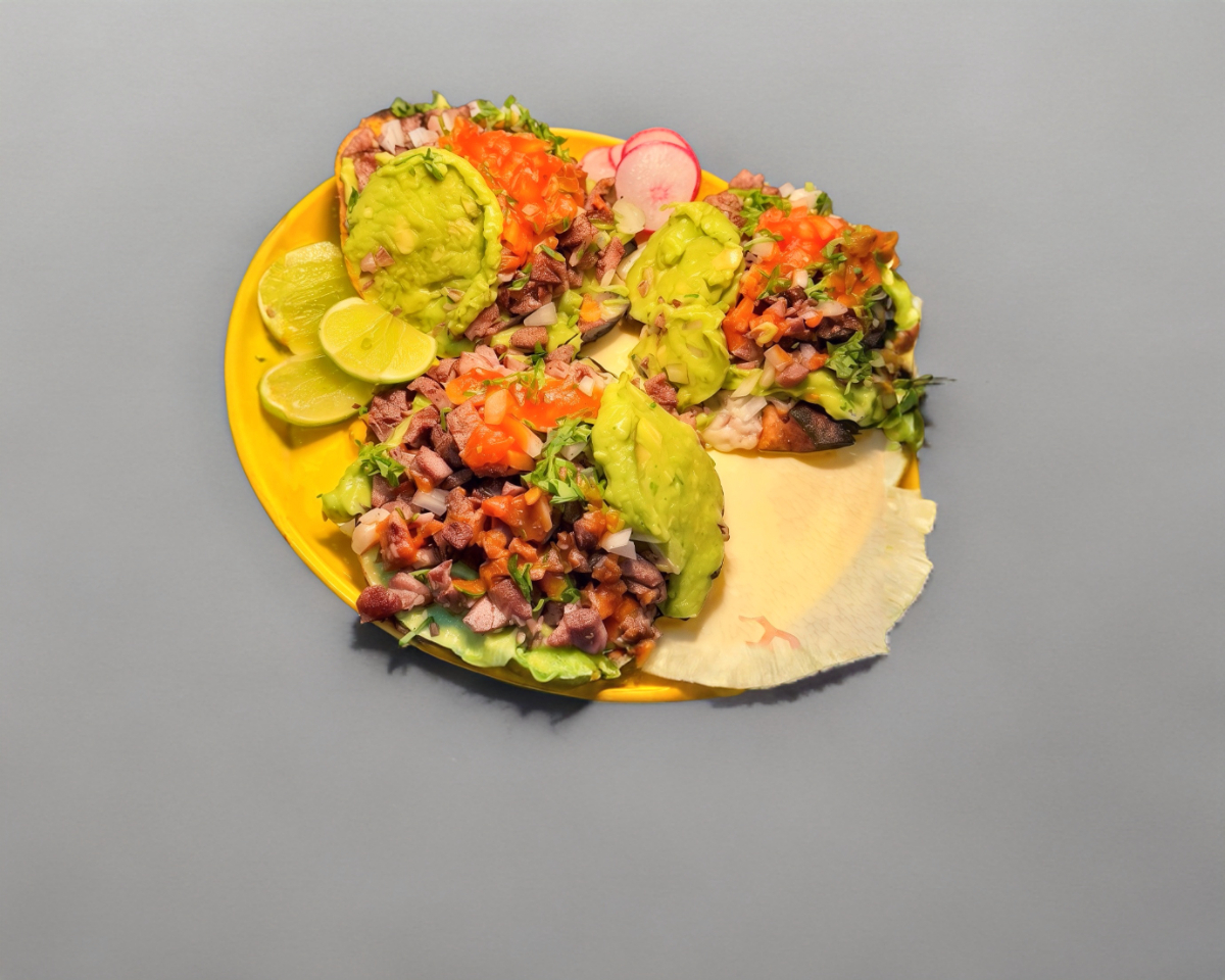 Tostada de maiz, carne de res marinada en casa y chorizo de cerdo premium, cilantro, cebolla blanca, salsa roja taquera y guacamole.