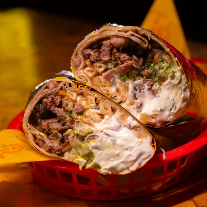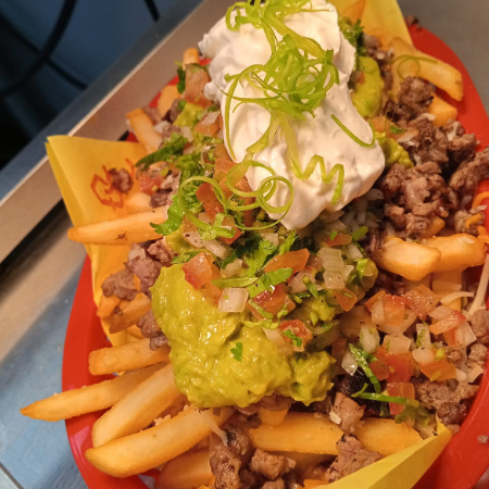 Tortilla de harina, relleno de carne asada, papas fritas, mezcla de quesos, salsa bandera, guacamole, crema y salsa a elegir: Roja o verde