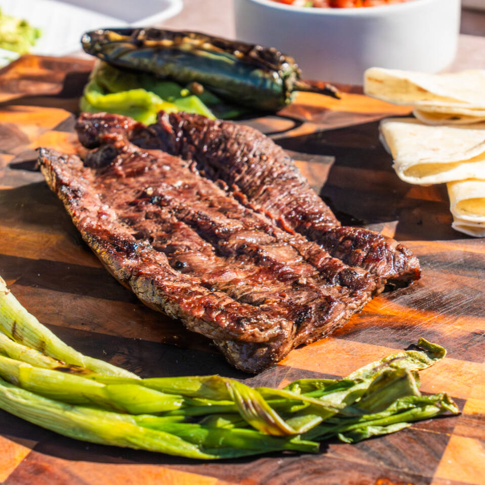 CORTE DE ARRACHERA 350 GRAMOS APROX. ACOMPAÑADO DE CHILES CALIFORNIA Y JALAPEÑOS ASADOS, TORTILLAS DE SU ELECCION Y SALSAS