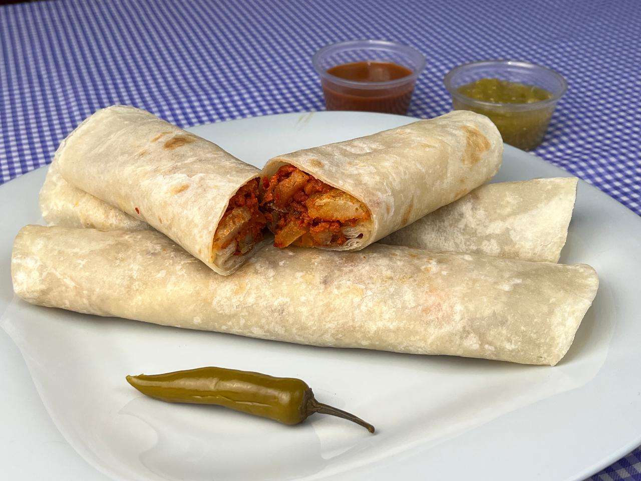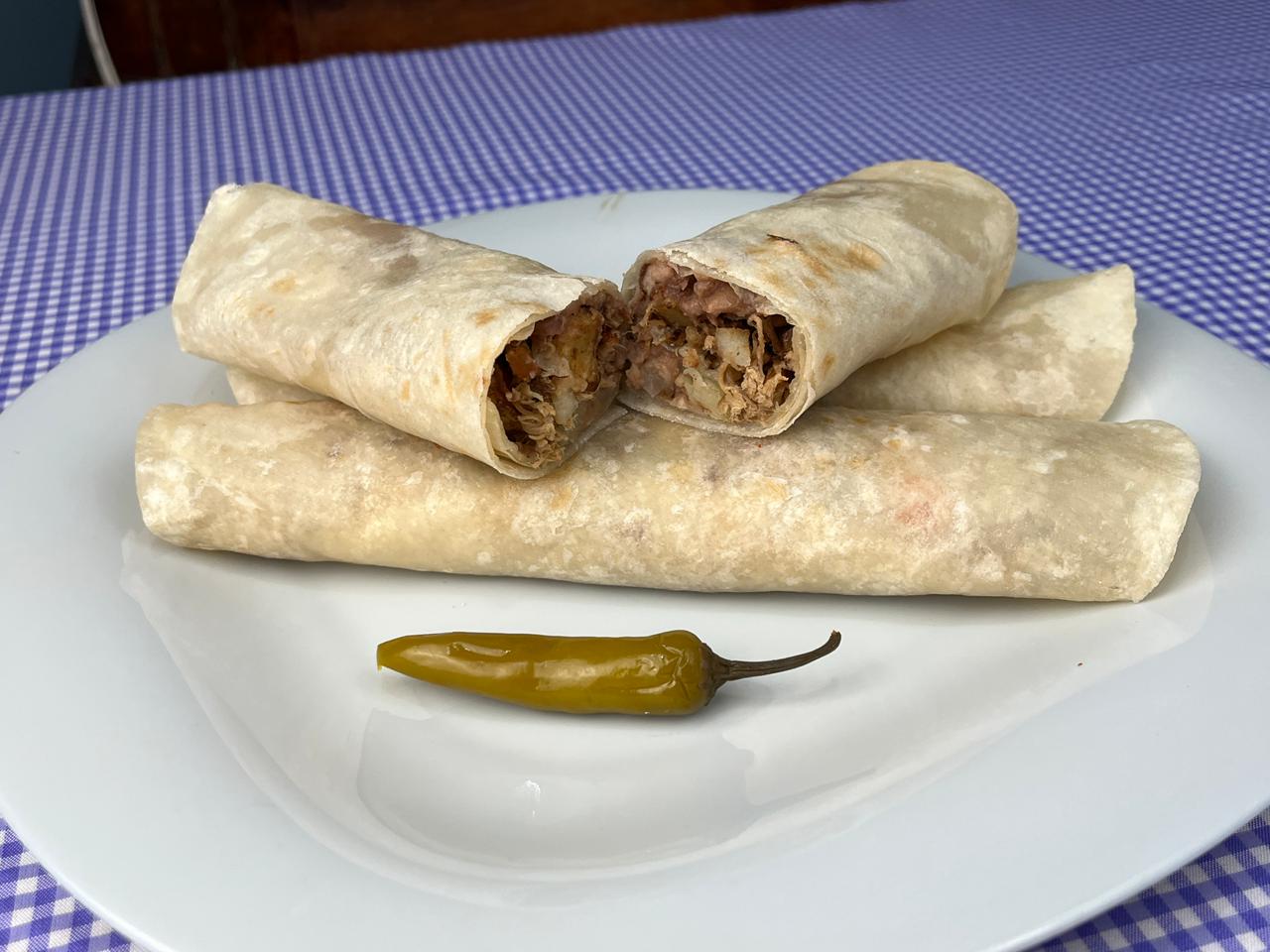 Tortilla de harina casera con frijoles y chorizo con papa. Acompañado con salsa verde o roja.