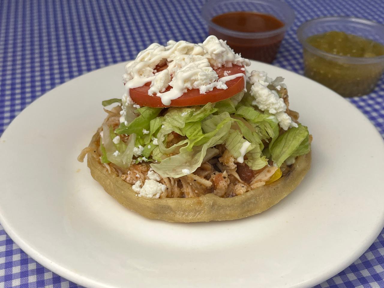 Sope casero con frijoles, tinga de pollo con chipotle, lechuga, tomate, media crema y queso fresco. Acompañado con salsa verde o roja.
