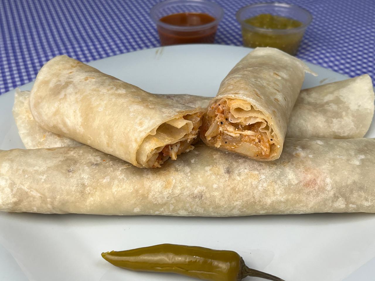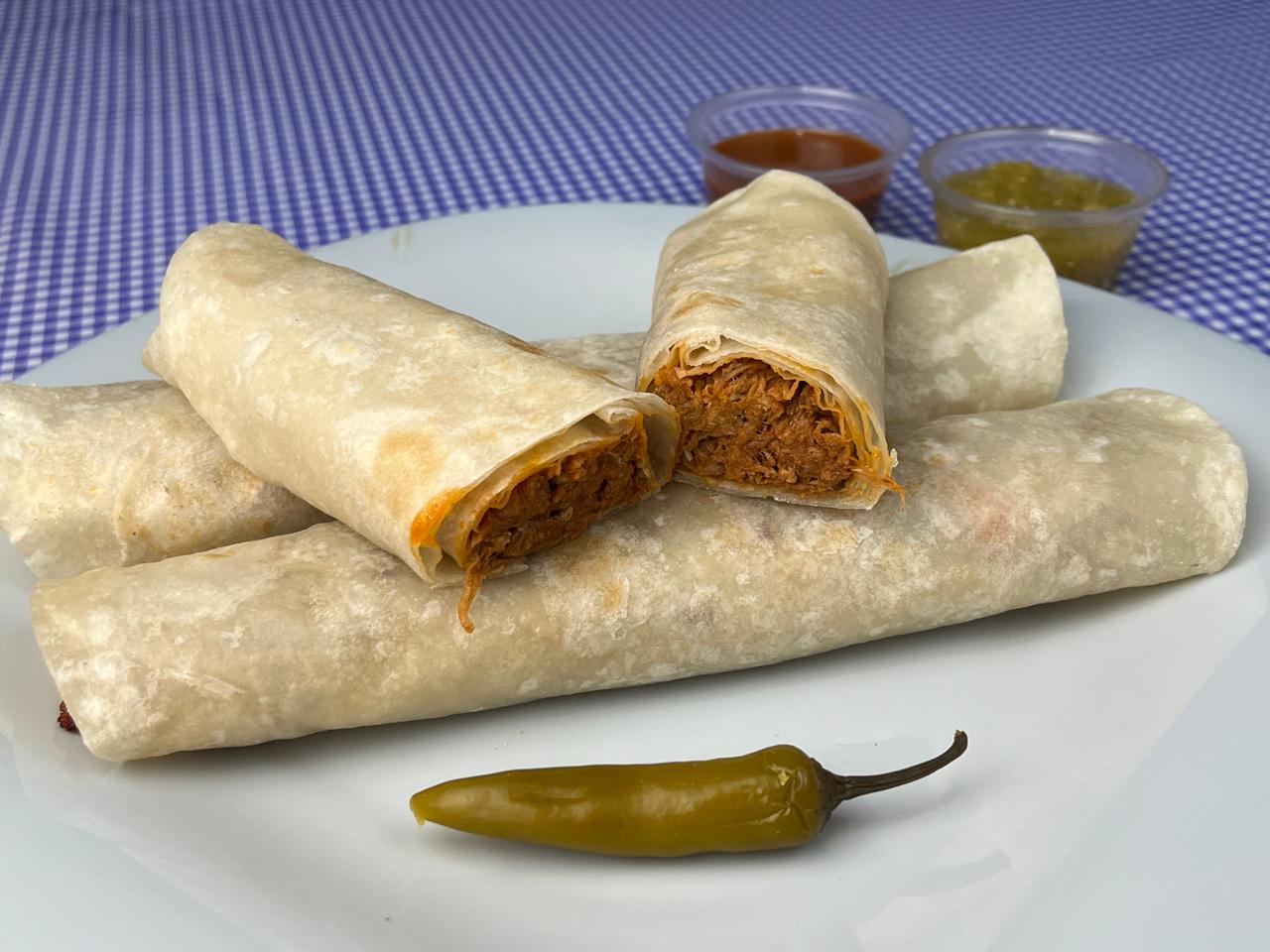 Saborea de 5 piezas de tacos dorados de los siguientes sabores: 2- de Pollo, 1 -de papa, 1- deshebrada de res, cada una con lechuga, queso y crema de leche, acompañada con salsa verde o roja