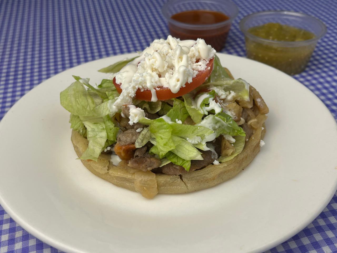 Sope casero con frijoles, bistec ranchero a la mexicana con papa, lechuga, tomate, media crema y queso fresco. Acompañado con salsa verde o roja.