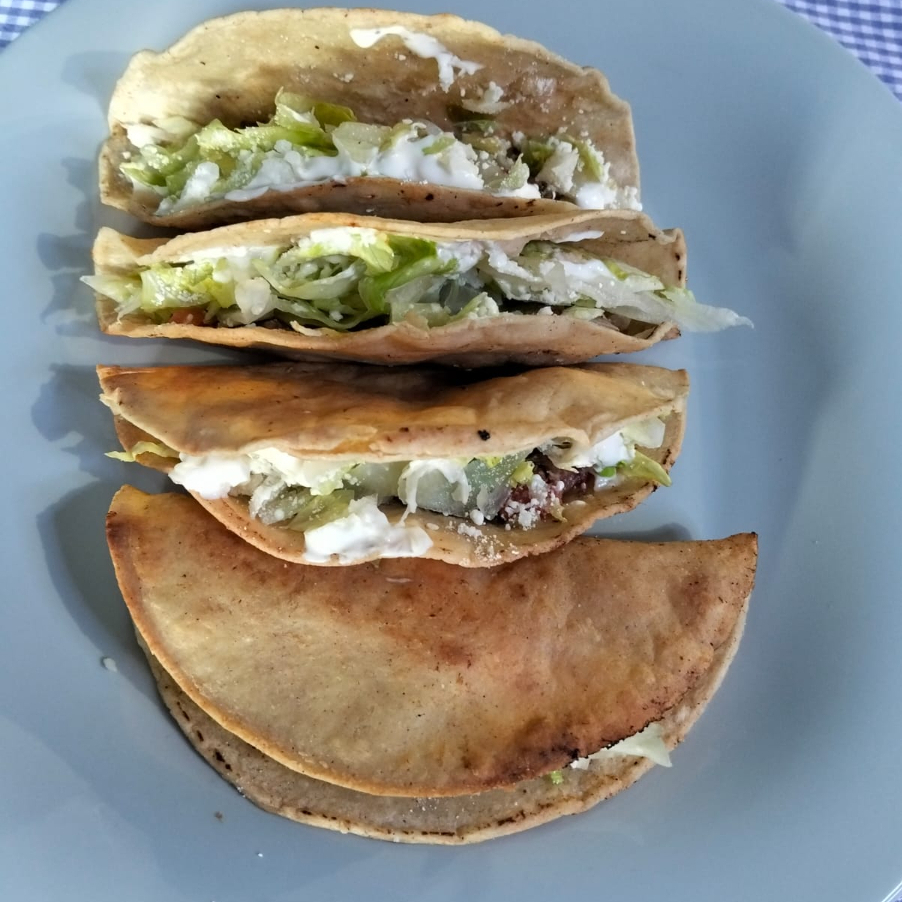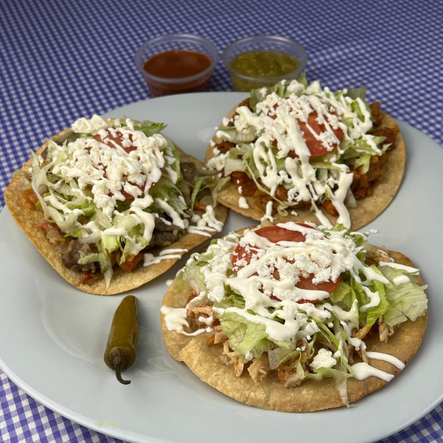 Tortilla de Maiz Tostado Casero, Frijoles Refritos, Lechuga, Tomate, Aguacate, Media Crema, Queso Fresco, Acompañada con salsa verde o Roja, Elegir relleno de Preferencia: Bistec Ranchero, Carne adobada deshebrada de Res, Tinga de Pollo con Chipotle, o combinados