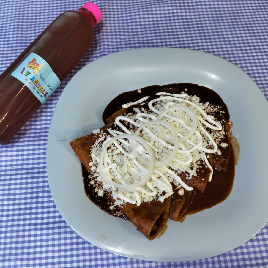 Mole Casero estilo Veracruz, 4 enmoladas rellenas de pollo o carne molida de res, con queso, media crema y cebolla Morada.