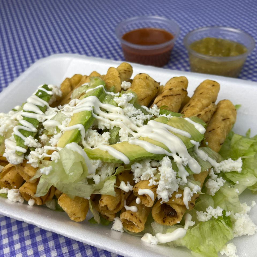 Flautas x10 con carne de res, repollo, media crema y salsa