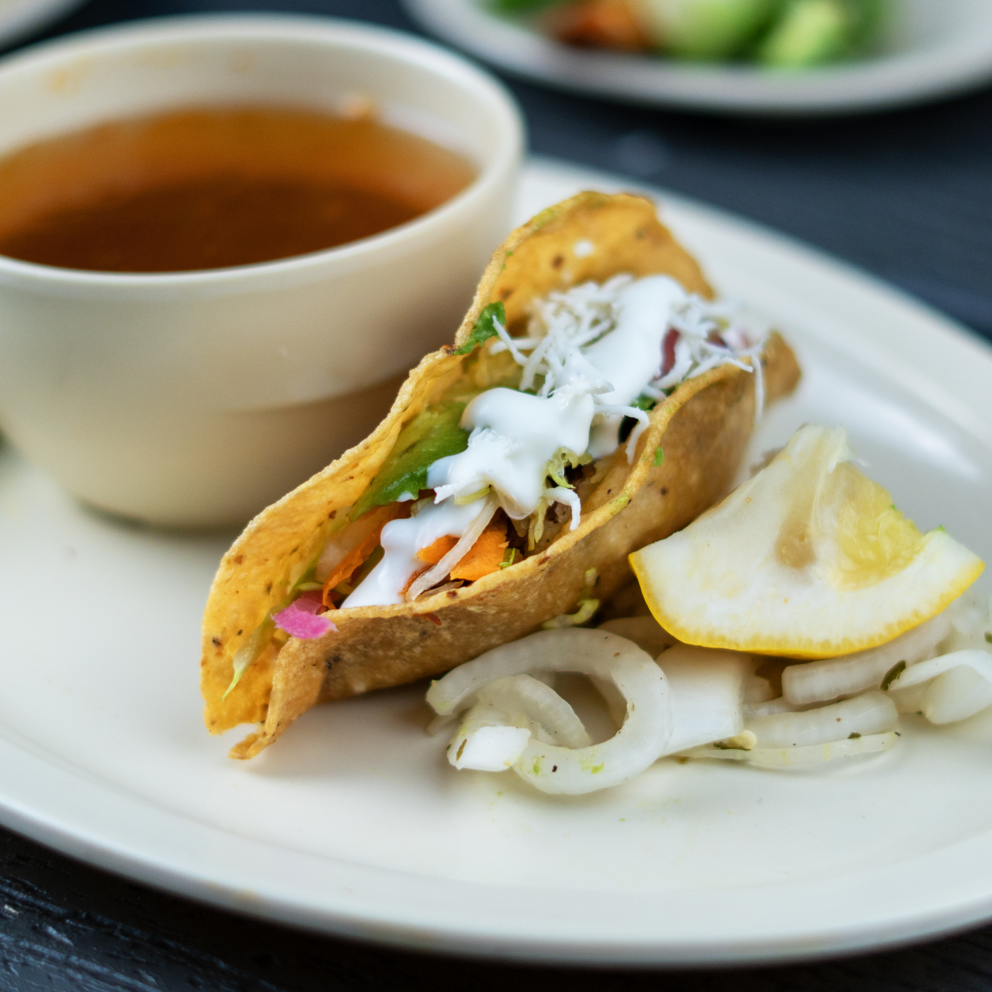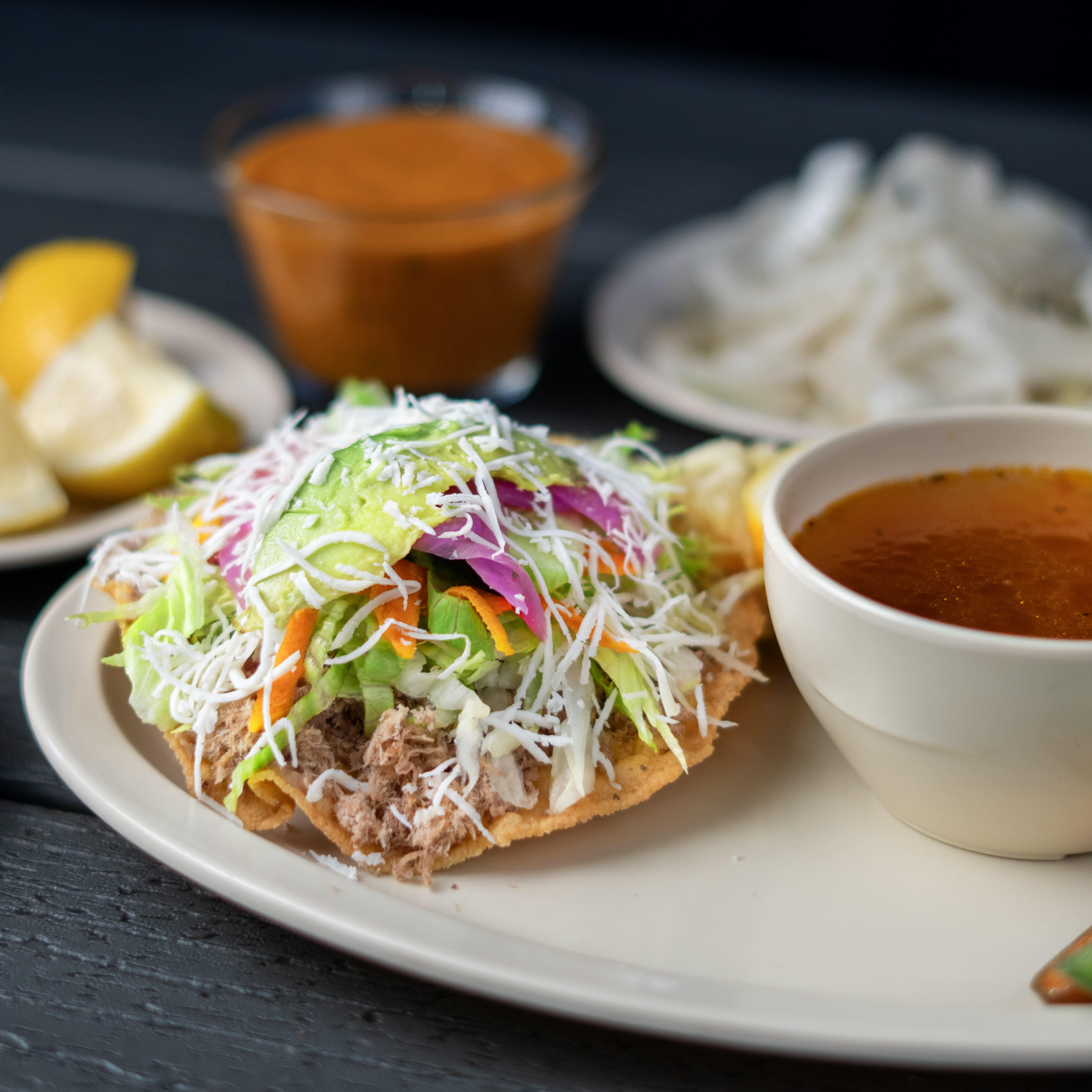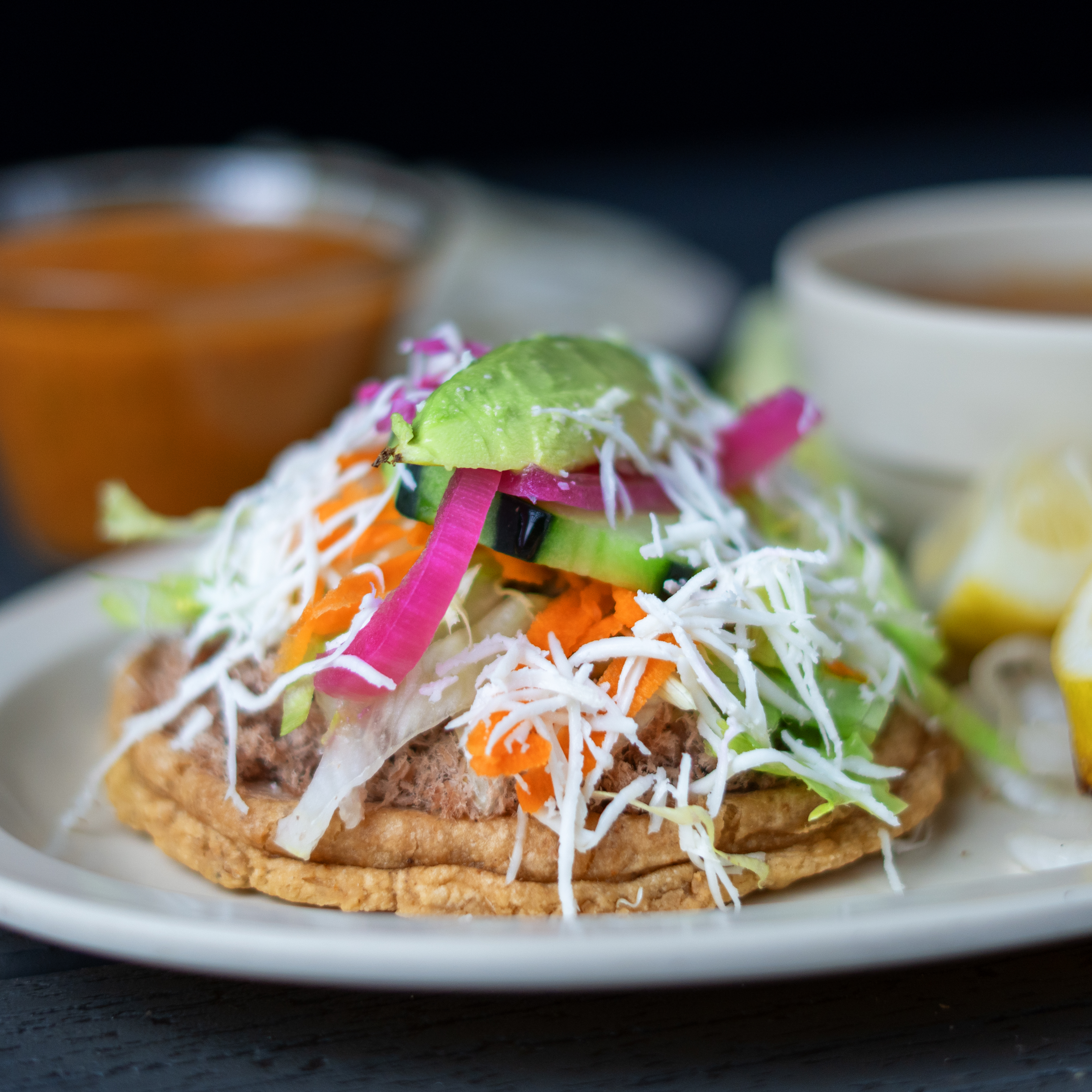 Sope de res o pollo con frijoles, lechuga, crema y queso.