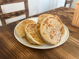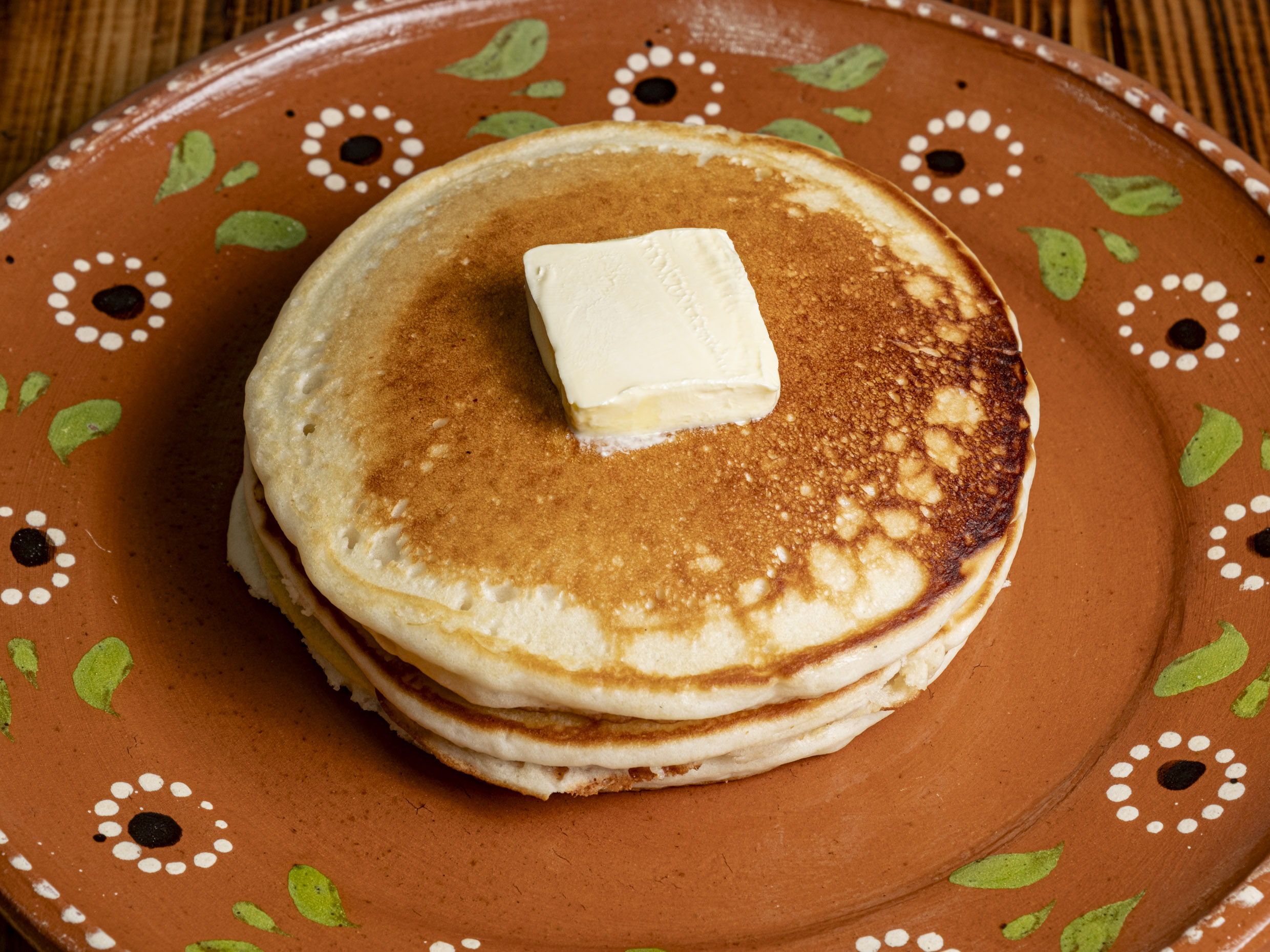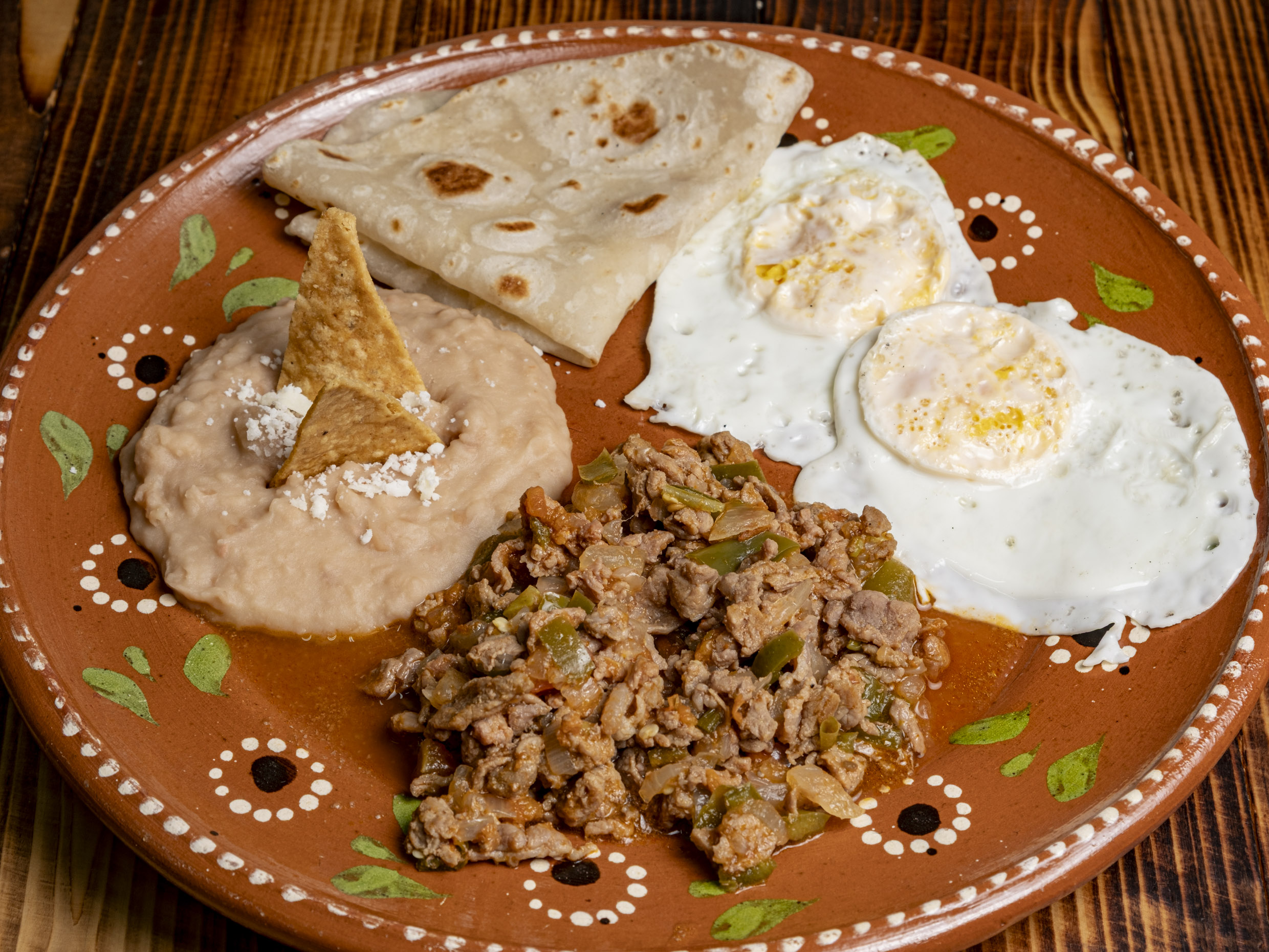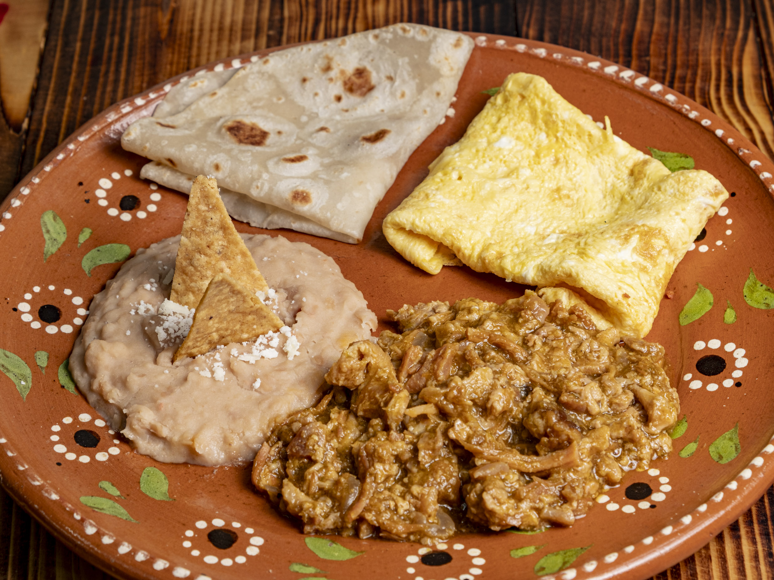 Omelete con queso,acompañado de carne puerco con chile rojo, bistec y papas con chorizo.