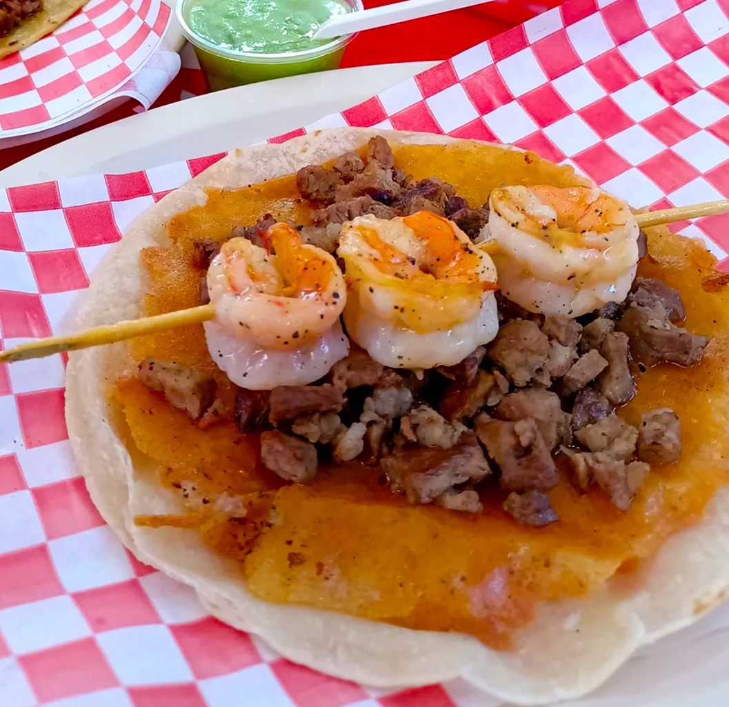 Taco de bistec y brocheta de camarón.