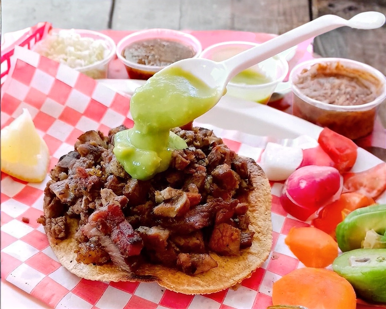 Tacos de Pastor a base de harina de maiz carne adobada de pastor cebolla cilantro aparte