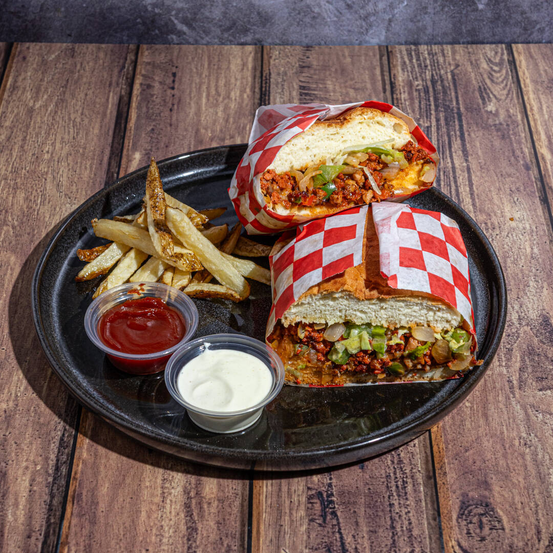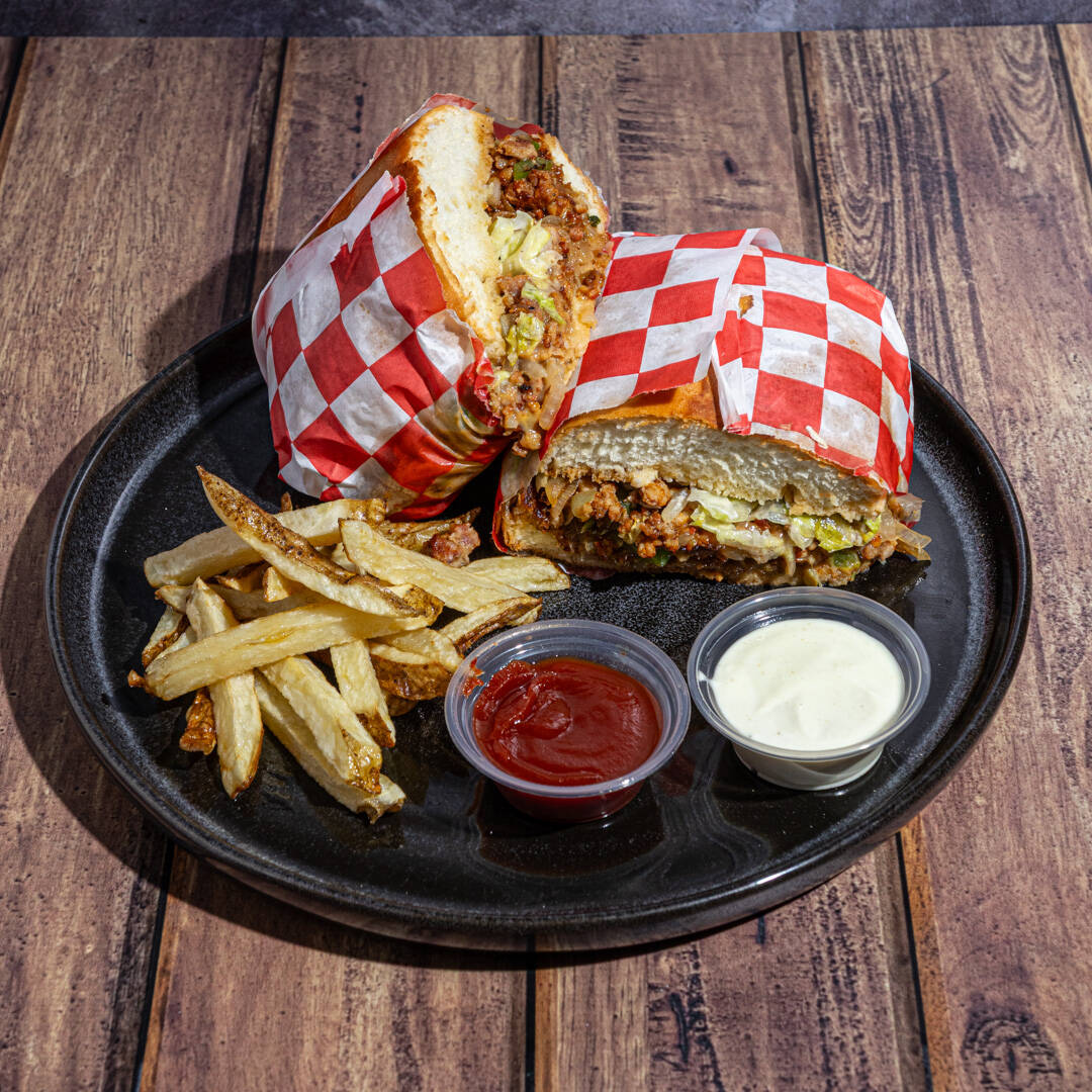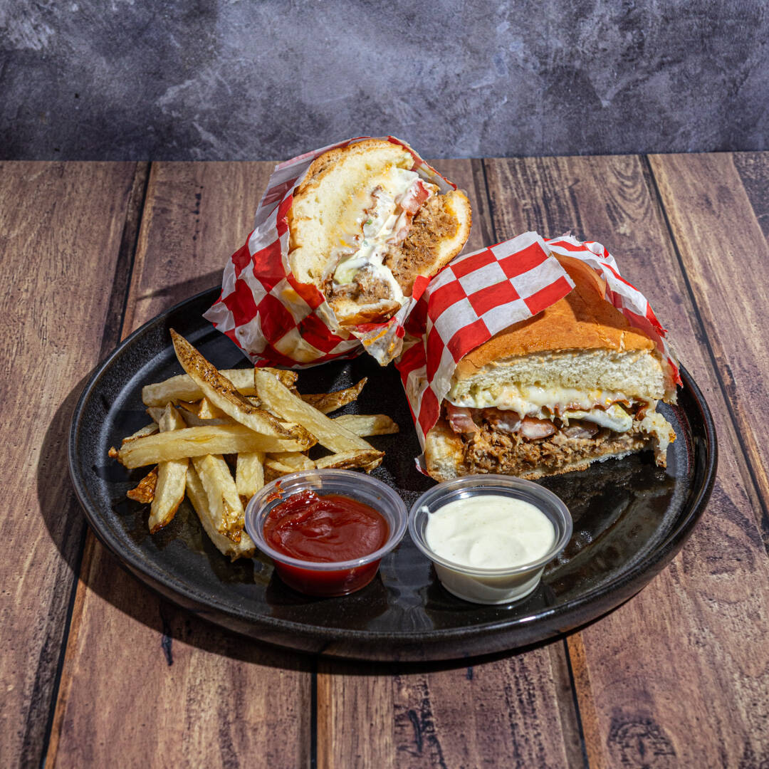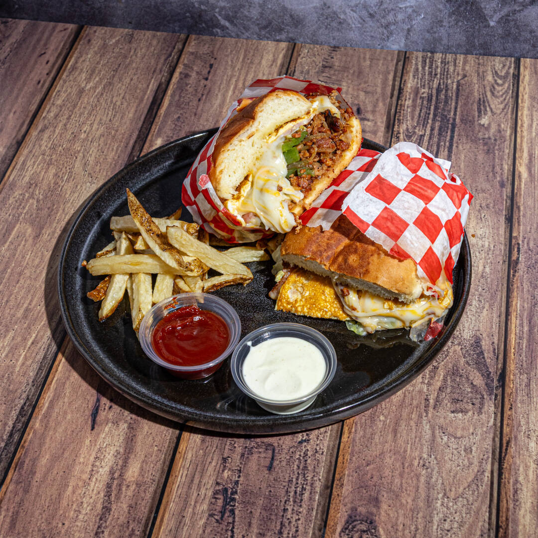PAN BIROTE ACOMPAÑADO DE JUGOSA PIERNA DE PUERCO, TOCINO, MORRÓN, CEBOLLA, CHAMPIÑON, HUEVO, QUESO MARMOLEADO, CREMA Y LECHUGA FRESCA.