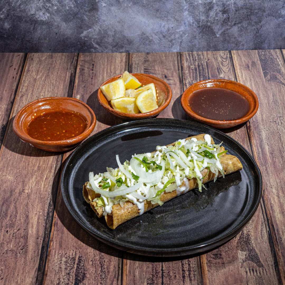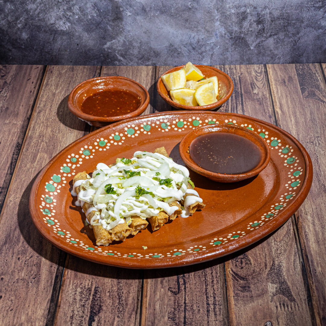 3PZ DE FLAUTAS RELLENAS DE RICA MACIZA DE PUERCO, ACOMPAÑADOS CON SALSA ROJA O VERDE, LECHUGA, CREMA Y UN RICO Y CALIENTE CONSOMÉ DE LA CASA.