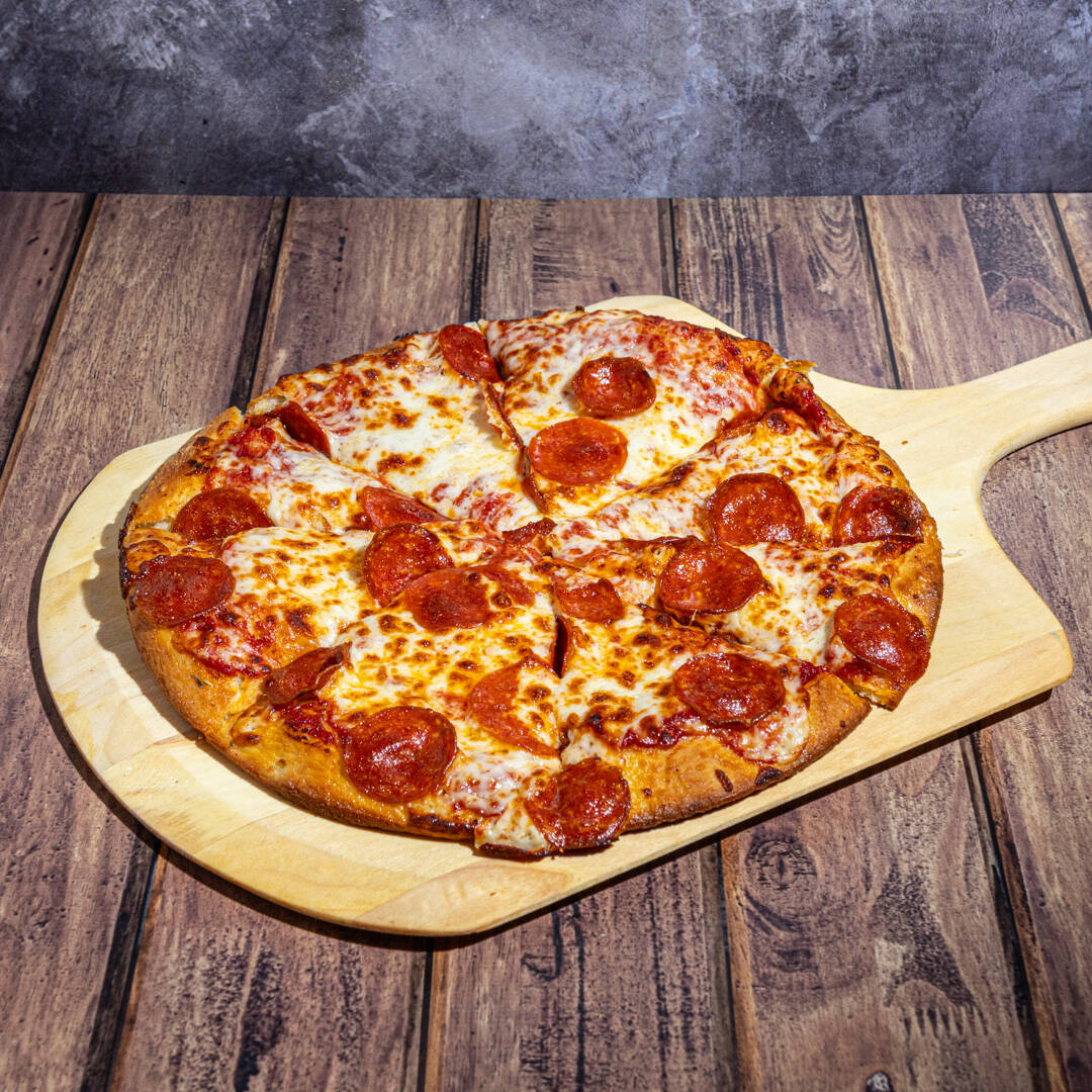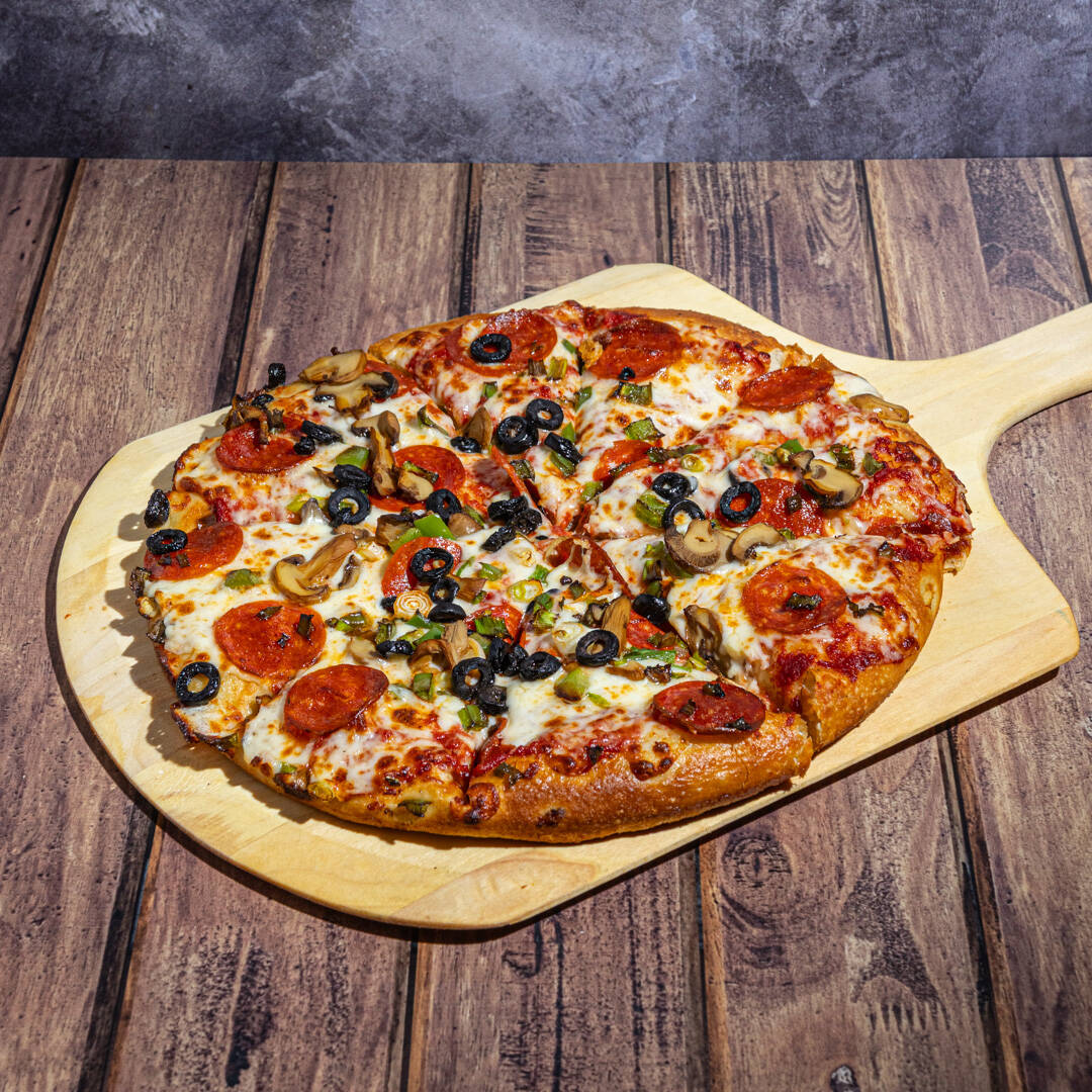 RICA PIZZA ESPONJOSA ACOMPAÑADA DE PEPPERONI, CHAMPIÑÓN, ACEITUNA NEGRA, MORRÓN Y CEBOLLA CAMBRAY FRESCO.