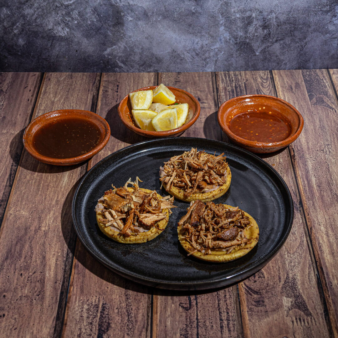 3PZ DE SOPES DE MAÍZ CON UNA CAMA DE FRIJOL REFRITO, JUGOSAS CARNITAS DE PUERCO, ACOMPAÑADOS CON SALSA ROJA O VERDE, LECHUGA, CREMA Y UN RICO CONSOMÉ CALIENTE DE LA CASA.