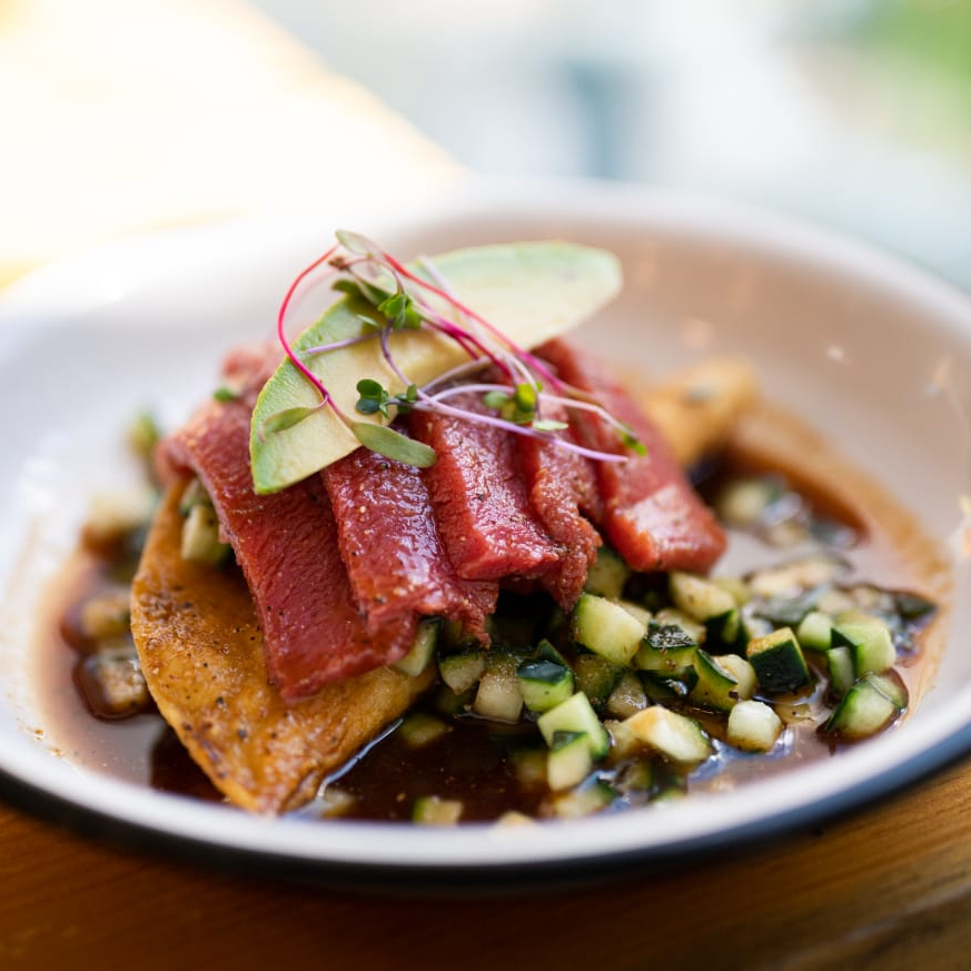 Corte de carne New York estilo tobichero, acompañado de cebolla morada, cilantro y mousse de aguacate.