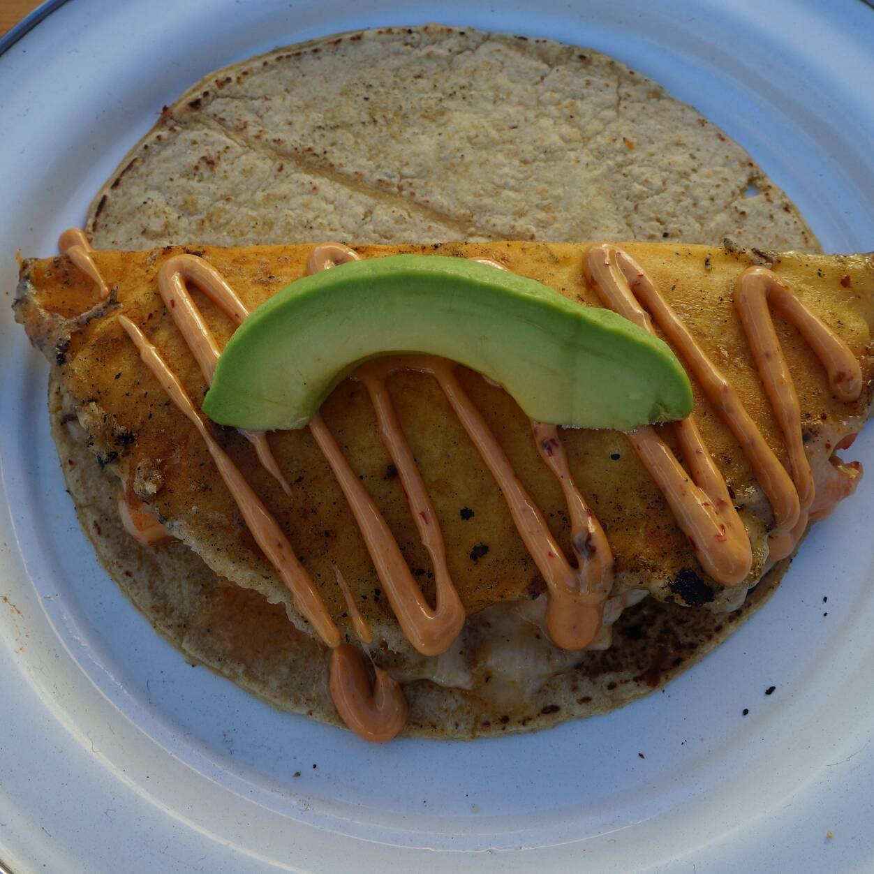 Costra de queso con camarón acompañada de mayonesa chipotle. .