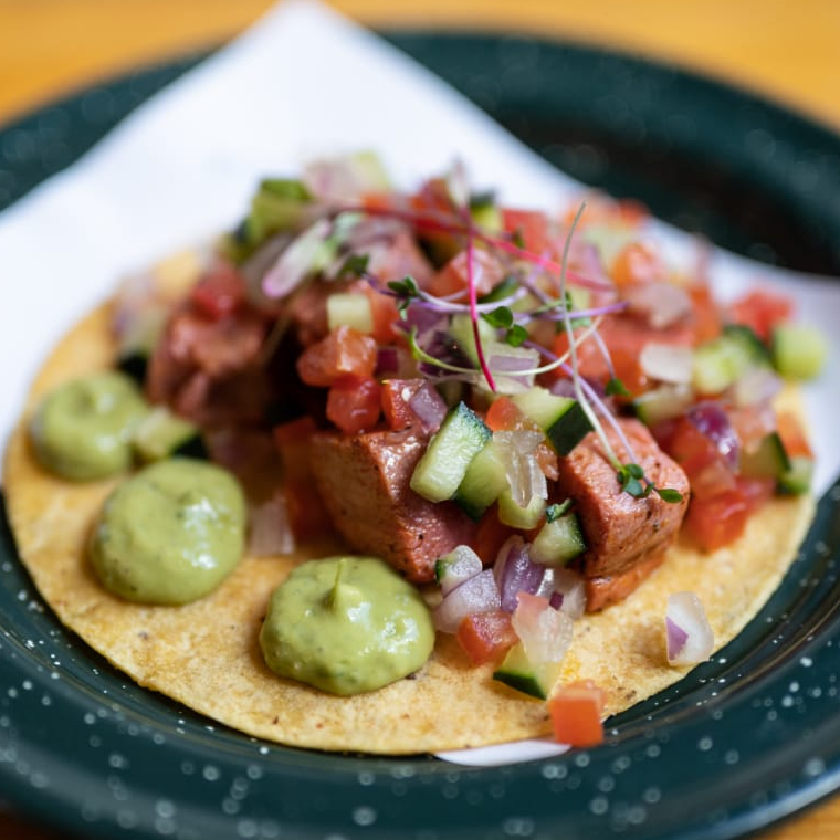 Delicioso taco de atún fresco sellado, acompañado de mousse de aguacate y salsa bandera.